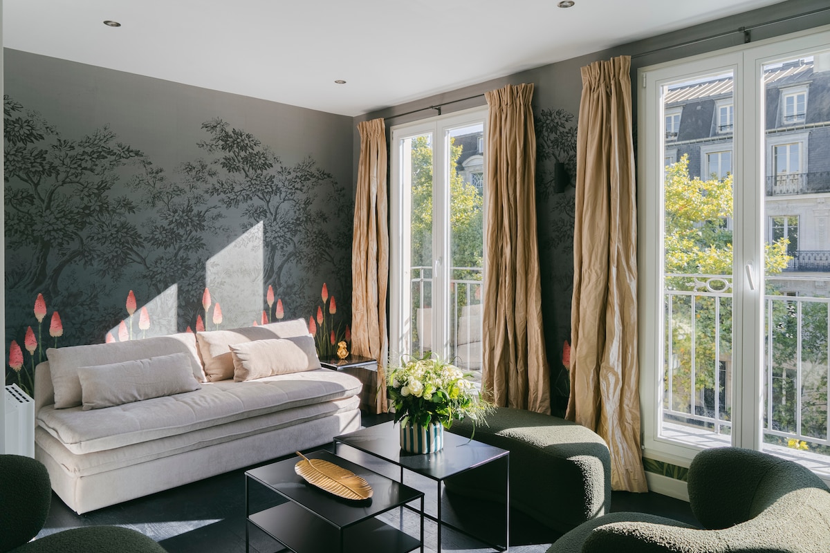 Notre appartement de 85 m², situé au 5ᵉ étage avec ascenseur, est cosy et lumineux, décoré avec mobilier design et art contemporain. Il comprend un séjour avec balcon fleuri et TV câblée, une cuisine séparée et équipée, deux chambres (lit 180×200 cm et lits 90×190 cm & 100×200 cm), une grande douche et toilettes séparées. Idéal pour un séjour parisien raffiné, à deux pas de commerces, cafés et du parc Monceau et de l'Arc de Triomphe. Non-fumeur, pas de fête ni de bruit.
