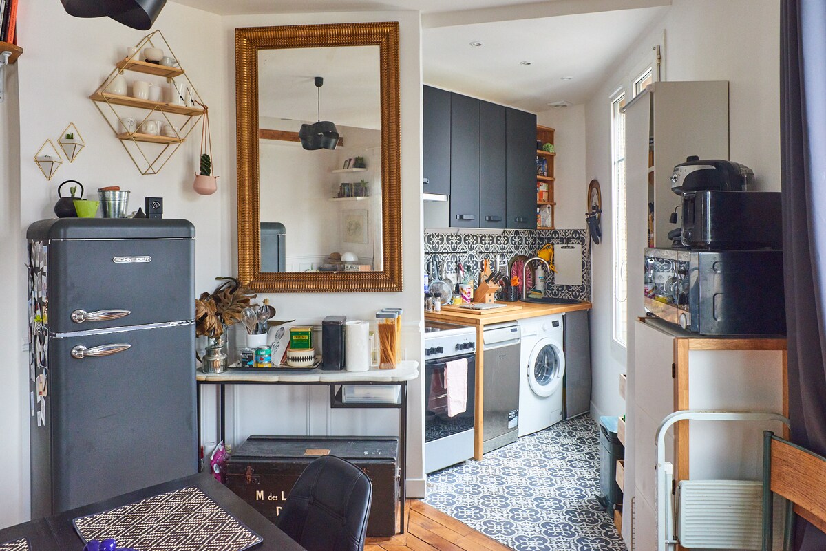 Welcome to my 50m2 flat where I live and work as a photographer (no ill smelling painting brushes!) at the 5th floor with lift in the 20th arrondissement, 50m from the amazing Belleville park. Fully equiped kitchen, Bathtub, Wifi. Let the ladder lead you to accessing the cosy, under-the-roof mezzanine with a very comfy double bed.
