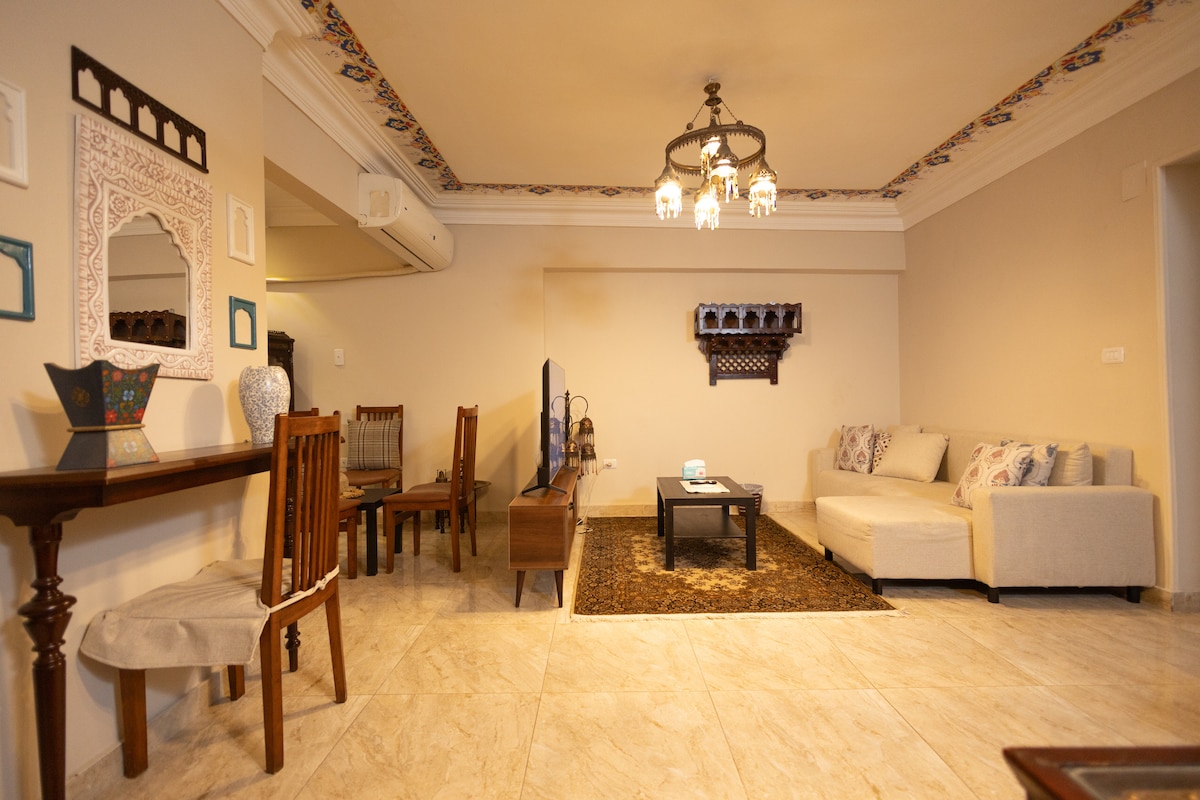 Geräumige Dokki Khan-Wohnung mit 2 Schlafzimmern – Voll möbliert Wenn du eine luxuriöse, voll möblierte Wohnung im Herzen von Dokki suchst? Diese wunderschön gestaltete Einheit mit 2 Schlafzimmern bietet alles, was man für ein komfortables Wohnen braucht. Mit modernen Annehmlichkeiten, klimatisierten Räumen und einer lebendigen, farbenfrohen Atmosphäre spiegelt es die lebhafte Atmosphäre der Gegend wider. Seine erstklassige Lage macht es ideal für Profis, Familien oder alle, die eine Mischung aus Komfort und authentischem Lebensstil in Kairo suchen.