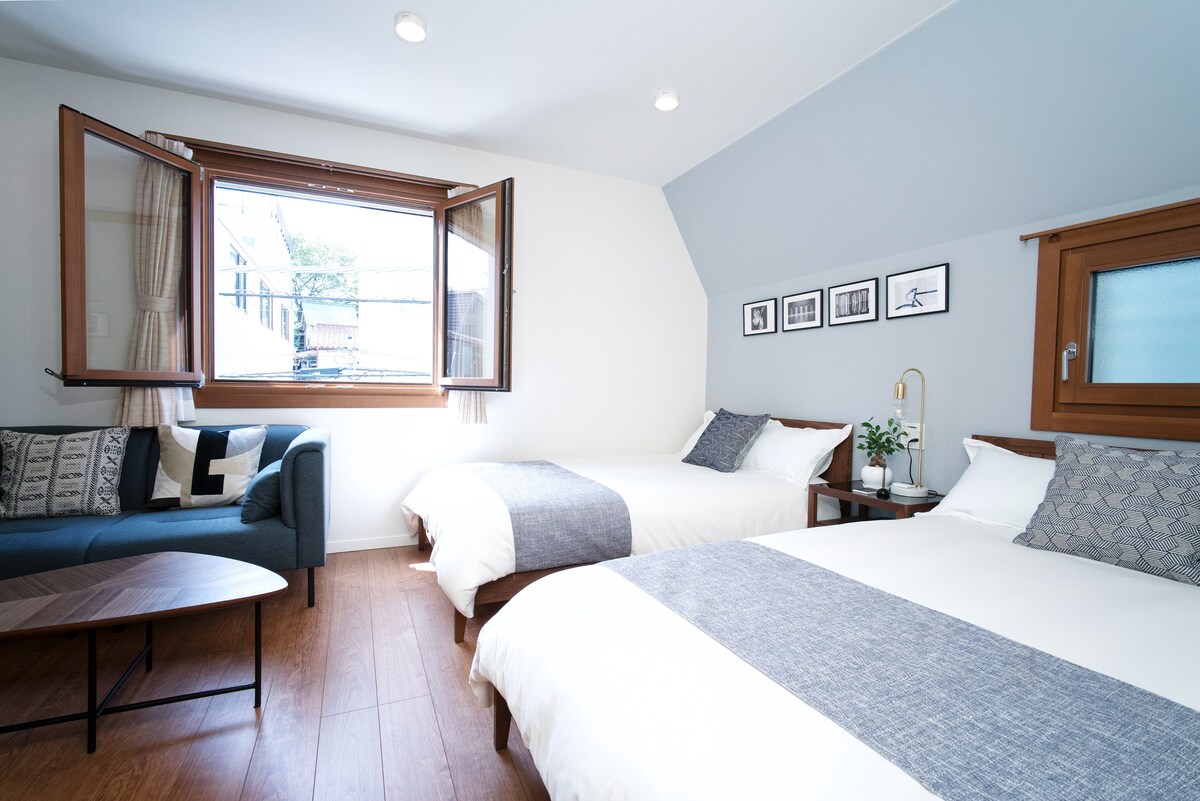 Just a 2-minute walk from the station, Palette House is a cozy and stylish retreat perfect for exploring Tokyo. The industrial-style kitchen includes an island bar, full cookware, wine glasses, and a water dispenser—ideal for cooking and evening drinks. The living room features natural driftwood décor and a comfy sofa, while the Japanese-modern bedroom offers a refined, relaxing space. With thoughtful amenities and warm design, it’s a perfect base for couples and families.