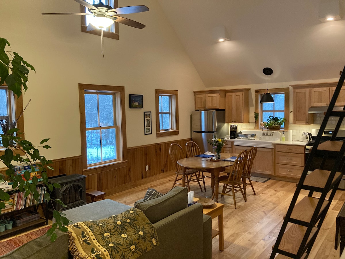 Offenes, luftiges Gästehaus aus recyceltem Holzrahmen. 1 Schlafzimmer mit einem Queensize-Bett und einem Schlafloft mit zwei zusätzlichen Queensize-Betten. Umgebaut aus einem alten Möbelgeschäft und befindet sich zwischen Middlebury und Burlington. Wir wohnen auf dem Grundstück in einer separaten Unterkunft. Gehe über einen gemeinsam genutzten Außenbereich zum Teich. Wandermöglichkeiten in der Nähe innerhalb einer 10 minütigen Autofahrt. Ausblicke auf den Cedar Lake und tolle Möglichkeiten zum Radfahren, egal ob Sie asphaltierte Straßen, Feldwege oder Mountainbike-Trails bevorzugen.