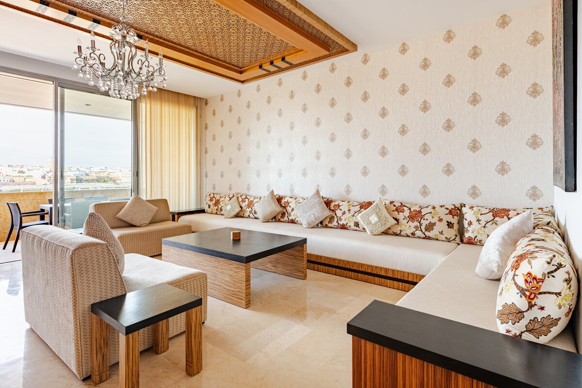 Elegant and comfortable apartment in the premium Orangeraie district of Rabat. Luminous living room with an open equipped kitchen and a quality sofa bed. The bedroom is quiet and offers a comfortable night’s rest. Enjoy a large terrace facing the main avenue and a second balcony overlooking the residence pool. Private Gym is available in ground floor. Cafés, grocery stores, Malls and Dar Es Salam Market nearby. Royal Golf Dar Essalam is 10 minutes away. Perfect for short or medium stays.