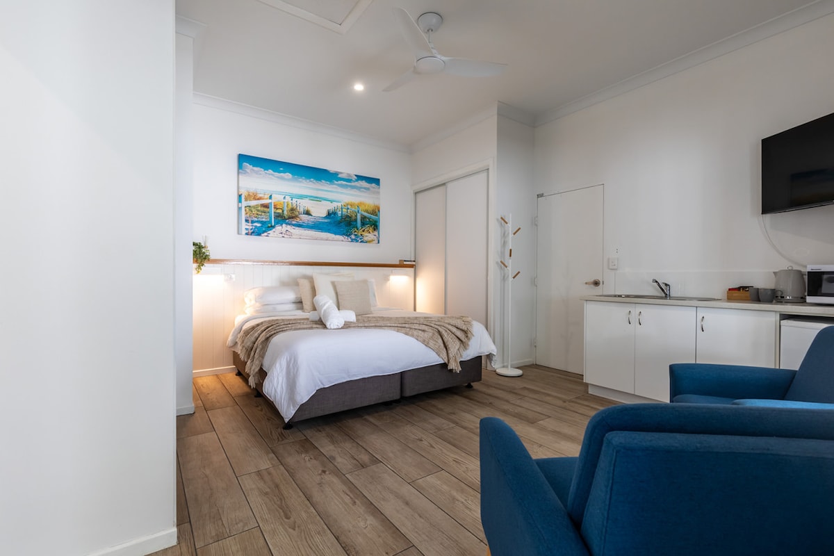 Eine stilvolle und wunderschön renovierte Unterkunft im Sandcastles Resort. Genieße den Komfort des Kingsize-Bettes und einer großzügigen Dusche im eigenen Badezimmer mit Annehmlichkeiten. Nur 160 m zu Fuß zum Strand Agnes Surf oder ein paar Minuten zu den Geschäften und Restaurants in der Stadt. Der Resort-Pool ist in der Nähe und das Restaurant Drift & Wood ist am Wochenende vor Ort für Getränke an der Bar oder ein fabelhaftes Essen mit Live-Musik.