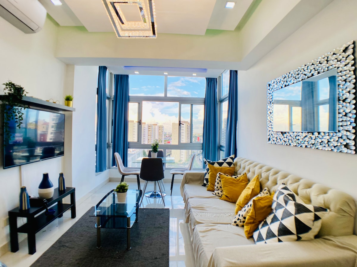 Apto en el 8vo piso moderno y seguro en una torre tipo hotel-condo! Este espacio equipado ofrece comodidades como una cama king y un sTV Smart y acceso a internet. Desde la ventana del dormitorio, podrás disfrutar de impresionantes vistas y en el piso siguiente al nuestro tendrás las áreas sociales (piscina, gimnasio y BBQ). Cercano al Blue Mall, restaurantes y supermercados te brinda tranquilidad y comodidad en el centro de la ciudad. ¡Disfruta de lo mejor de Santo Domingo. Incluye un sofá cama