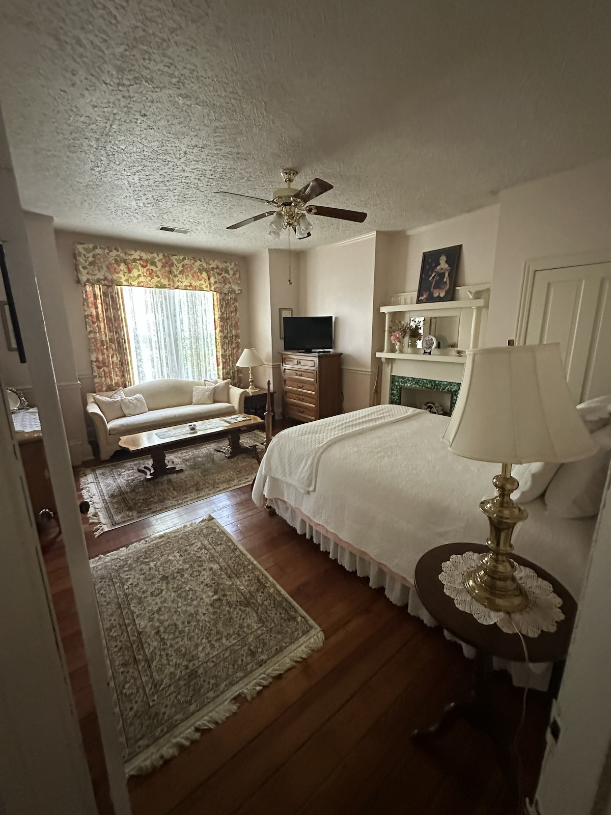 Helle, charmante 408 Quadratfuß große Studio-Wohnung mit Queensize-Bett, Schreibtisch, Loungesessel/Ottomane, 3-teiligem eigenem Badezimmer und Küchenzeile (Spüle, Minikühlschrank und Mikrowelle). Zur Ausstattung gehören auch ein eigener Kleiderschrank, eine gut sortierte Kaffeestation, ein Smart-TV, ein Gepäckablage, ein Bügelbrett in voller Größe und ein Föhn. Fenster und französische Türen bieten römische Jalousien mit Verdunkelungspaneelen für Privatsphäre. Der Zugang zu einem Sitzbereich an der Feuerstelle im Freien ist ebenfalls inbegriffen. Bequem zu lokalen Sehenswürdigkeiten in Aiken, SC und Augusta, GA.