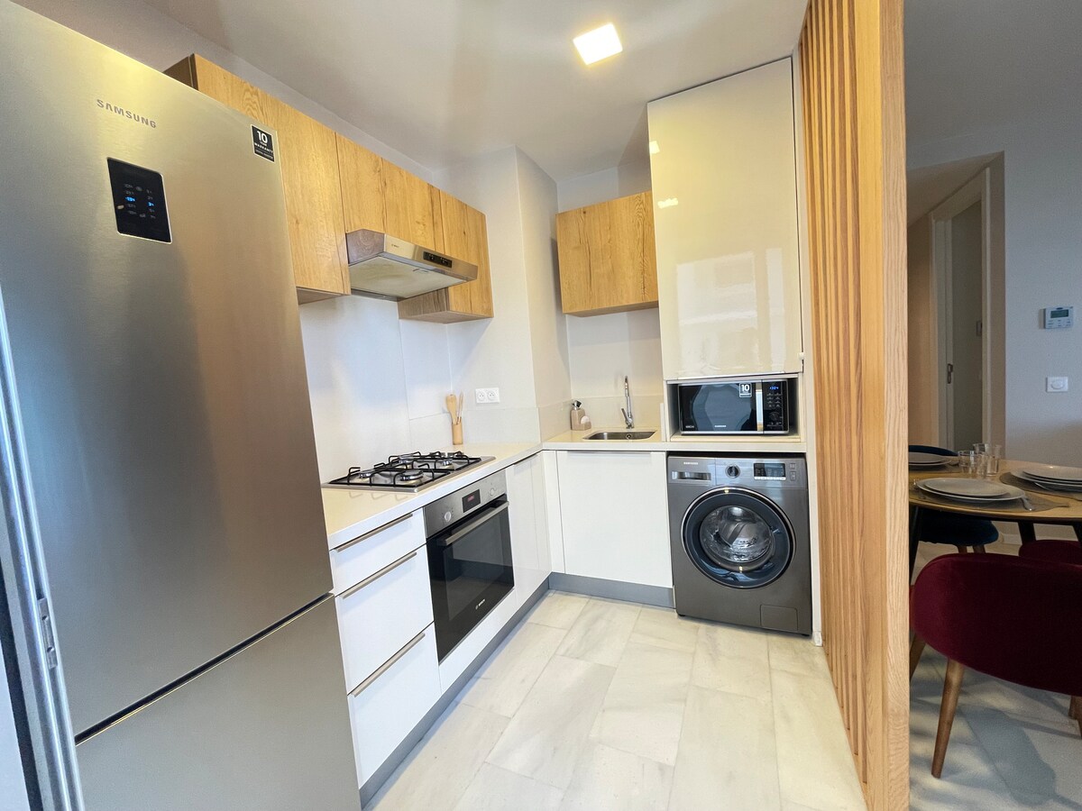 ✨ Elegant retreat in the heart of Casablanca, right across from Casa Port train station. This bright and spacious 83m² apartment offers all the comfort you need for a perfect stay and can comfortably accommodate up to 5 guests. It features 2 peaceful bedrooms with garden views, a home cinema-style living room (75" TV), a balcony overlooking the Hassan II Mosque, a fully equipped kitchen, and a dedicated workspace. Perfect for relaxing moments, whether for a weekend or an extended stay 🌇🌿