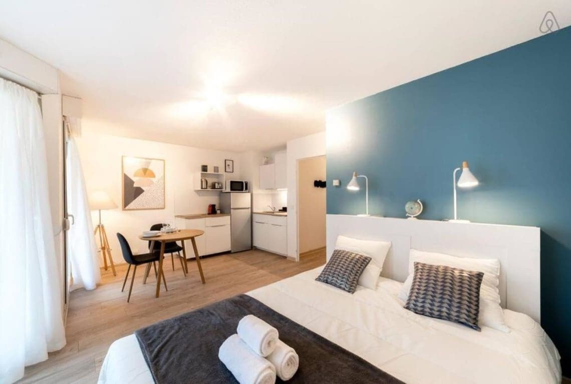 Appartement cosy bleu, rénové à neuf en 11/2018, hyper centre-ville Annecy. Vous aimerez l'emplacement et la décoration. Tout se faire à pied, 100 m de la gare SNCF, quelques pas du lac, à proximité des restaurants, shopping, bus, train, balades... Situé au 1er étage, l'appartement BLEU décoré au goût de style scandinave, il comporte un coin nuit, salon et la cuisine équipée ouverte sur le salon, un frigo congélateur, une machine à café, une bouilloire, micro-ondes, des plaques inductions, lave-linge... - Coin lit avec lit de 140x190, des étagères...L'appartement peut accueillir 3ème, 4ème personne avec un canapé convertible. - Salle de bain équipée d'une cabine douche, d'un lavabo, d'un sèche-cheveux, des rangements... - Draps, couette, oreillers, serviettes et produits de douches fournis. - La boisson, les pâtes, le café, thé sont aussi fournis. - TV HD avec Accès à internet haut-débit gratuit. Tout l'appartement est accessible aux voyageurs. Situé à 100 mètres de la gare et à quelques pas du lac, l'immeuble se trouve à proximité de nombreux restaurants, commerces et de plusieurs lignes de bus. La localisation est excellente pour se promener à pied dans tout le centre d'Annecy. Vous venez en train: L'immeuble est à 100m de la gare En voiture: Parkings couverts payants sont à 100m: parking Gare, parking Chevêne En vélo: l'immeuble dispose d'un garage à vélos au sous-sol. Les boutiques de location de voitures, vélos sont à côté de l'immeuble. Les parkings couverts payants sont à 100m: parking Gare, parking Chevêne