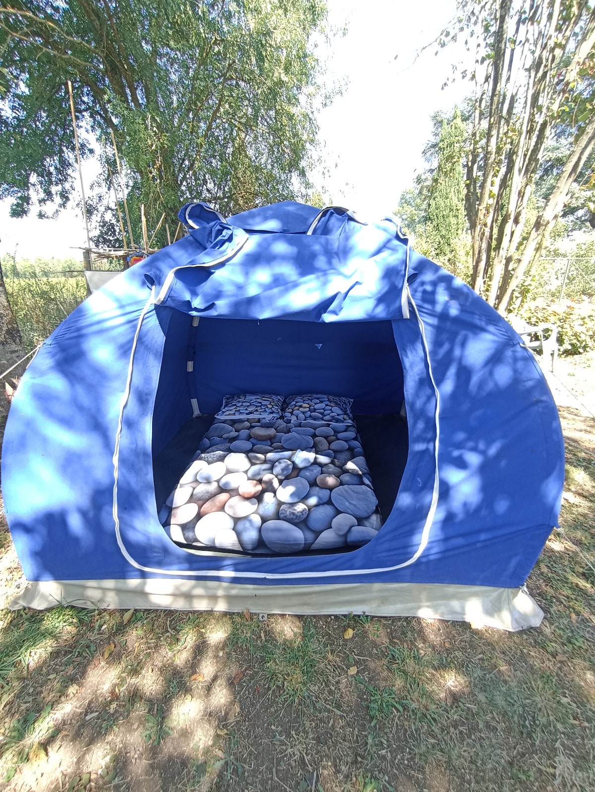 Sur un terrain sans vis à vis, location de tente pour amis motards, cyclistes ou marcheurs. Idéalement placé sur la voie bleue, une halte pour le repos du guerrier avec douche solaire et toilettes sèches à disposition ! transats, table, chaises, hamacs vous sont gracieusement prêtés. Un barbecue est disponible (apport de votre charbon de bois requis ou supplément..) Venez flemmarder et vous ressourcer avant de reprendre la route 🙂