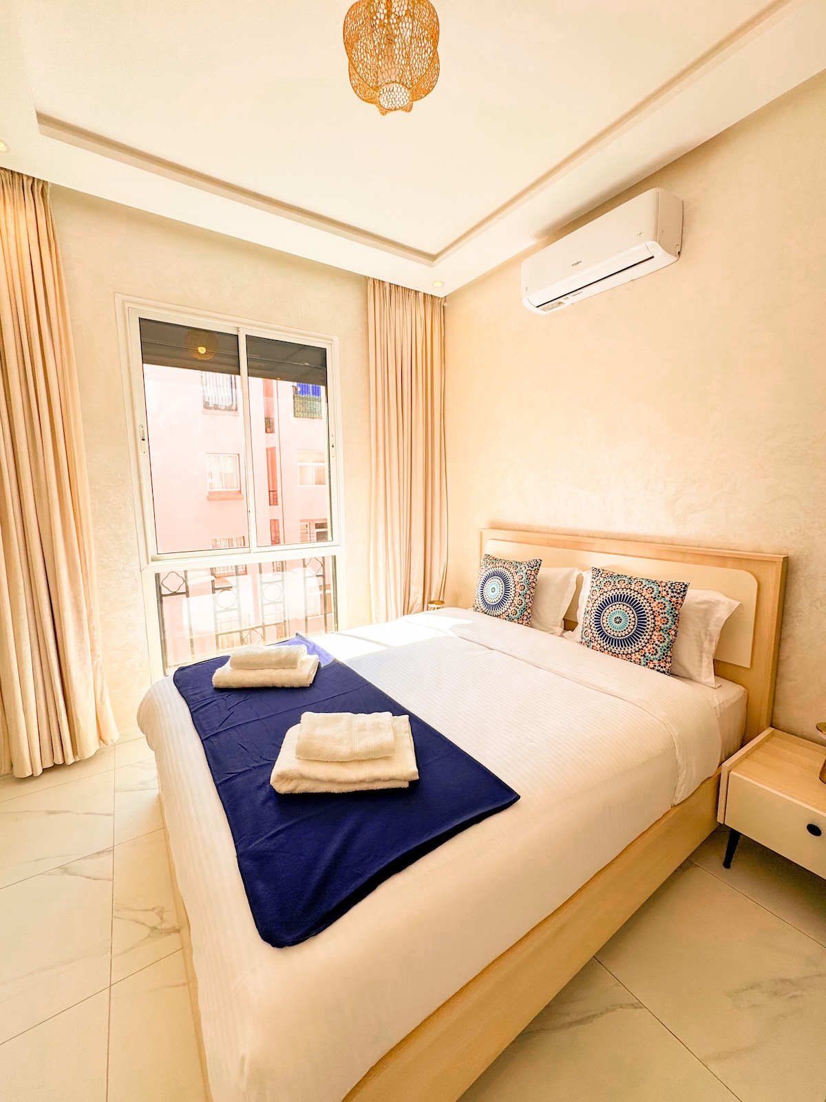 Luxuriöse moderne Wohnung im Stadtzentrum neben dem Flughafen In der Nähe: • 4 Minuten vom Flughafen entfernt • 10 Minuten vom berühmten Platz Djemaa El-Fna • 11 Minuten vom Stadtzentrum von Guéliz Übernachten Sie in unserer eleganten, komfortablen und hellen 2-Zimmer-Wohnung, die Wohnung ist leicht zugänglich und sehr praktisch, um Ihr Gepäck abzustellen.