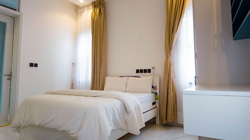 Safe, spacious, peaceful , more over a home sighted on 24plots with wifi accessibility in all spaces. Our space boast of 24hours Security Man at post, Security doors, 24hours CCTV surveillance, Electric Wired Fence, 24hours uninterrupted power (standby plant), two Swimming Pools, play ground for kids, a bar, sitting areas on premises for fresh air and swings. Games like billiards, table tennis, oware, ludo, cards.