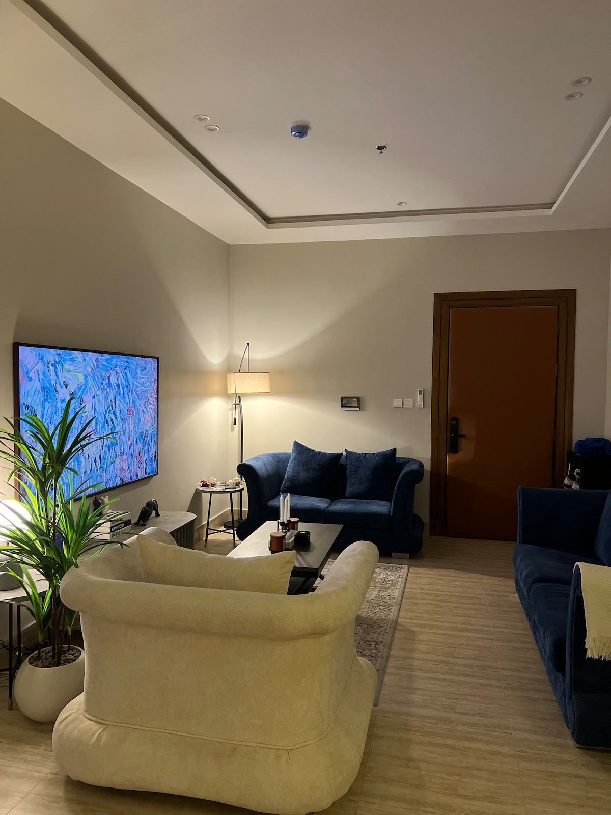 Das Luxus-Apartment in Al Khobar besteht aus 2 Schlafzimmern mit 2 Badezimmern und einem geräumigen Wohnzimmer mit Küche und Essbar mit komplettem Hotelzubehör. Mit einem vollen Platz für die großen Spiele Familienbettwäsche mit Kissen wechselt ein Hotelsystem Gemeinsamer Außenpool Mit Selbst-Check-in Selbsttrocknungsgerät Mit luxuriösen Hotelmöbeln ausgestattet Es gibt eine Wäschewäsche von der Tür der Wohnung ( gegen eine Wäschegebühr ) Die Wohnung liegt strategisch günstig 2 Minuten von der Bahrain Bridge entfernt. Und in der Nähe des Halbmondstrandes und in der Nähe des Khobar-Zentrums und seiner Touristenattraktionen sind auch gerne für dich da