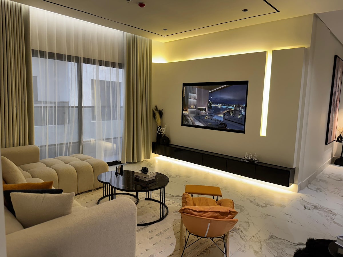 Luxuriöse moderne Wohnung in Al Khobar Ein stilvoller Aufenthalt, der Komfort und Luxus verbindet. Merkmale der Wohnung: • 2 Schlafzimmer mit bequemen Matratzen • Ein Saal mit einem 75-Zoll-Smart-TV • Netflix- und Watchvip-Abonnement • Selbsterwerb • Saubere Badezimmer mit Grundausstattung Ideale Lage: • 3 Minuten von der Bahrain Bridge entfernt. • 5 Minuten von Al Khobar Corniche entfernt • 10 Minuten von der Al Rashed Mall entfernt • 15 Minuten von Haff Moon entfernt • In der Nähe des Ajdan Walkway Wook und der Insel Al-Daghir