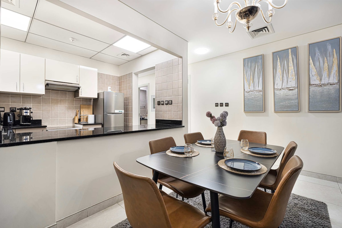 Welcome to your home in Meydan! This modern one-bedroom apartment at Polo Residence is just 10–15 minutes from Burj Khalifa and Downtown Dubai. Perfect for business or leisure, it offers comfort and convenience. Inside, enjoy a queen bed(Additional mattress available), two bathrooms, and tech perks like an 85-inch Smart TV, PS4, and streaming platforms. Laundromat is available at the Spinneys compound as an additional service. High-speed Wi-Fi and cozy touches make it a great base for exploring