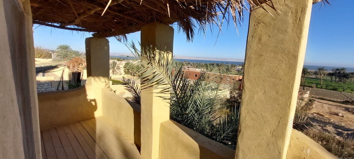 Beit Ain al Haya is an old traditional architected house with high ceilings, domes and arches. From the rooftop you are overlooking the Quarun Lake and the desert. The big unit of this house has an amazing huge rooftop and access to garden. In the sleeping room you have a 1,60m bed and an extra Sofa and a fireplace. In the huge reception 2 extra persons can sleep on the comfortable sofas. The house is equipped with WiFi and working tables, vans and heater. Parking inside the property.