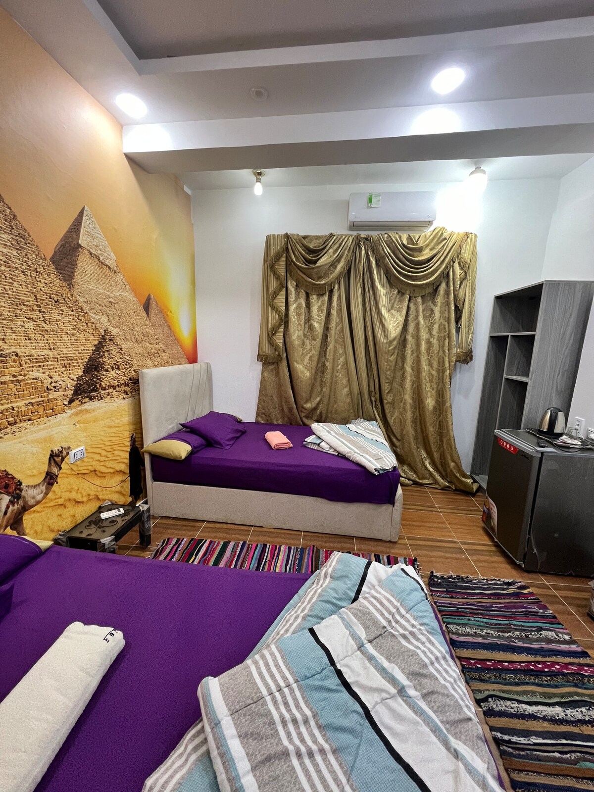 Das Zimmer befindet sich in unserer 2. Etage und ist eines der neu renovierten Zimmer. Die Gäste genießen den Aufenthalt in einem wunderschön gestalteten Zimmer mit ägyptischem Thema mit einem 1 Doppelbett, Queensize-Bett und Blick auf die Pyramiden von der Dachterrasse!Es gibt eine Kaffee-/Teestation mit kostenlosem Wasser. Dies ist ein familiengeführtes Unternehmen, und wenn du hier bist, bist du Familie. Egal, was du benötigst, lass es uns wissen. Jedes Zimmer hat ein eigenes Bad.