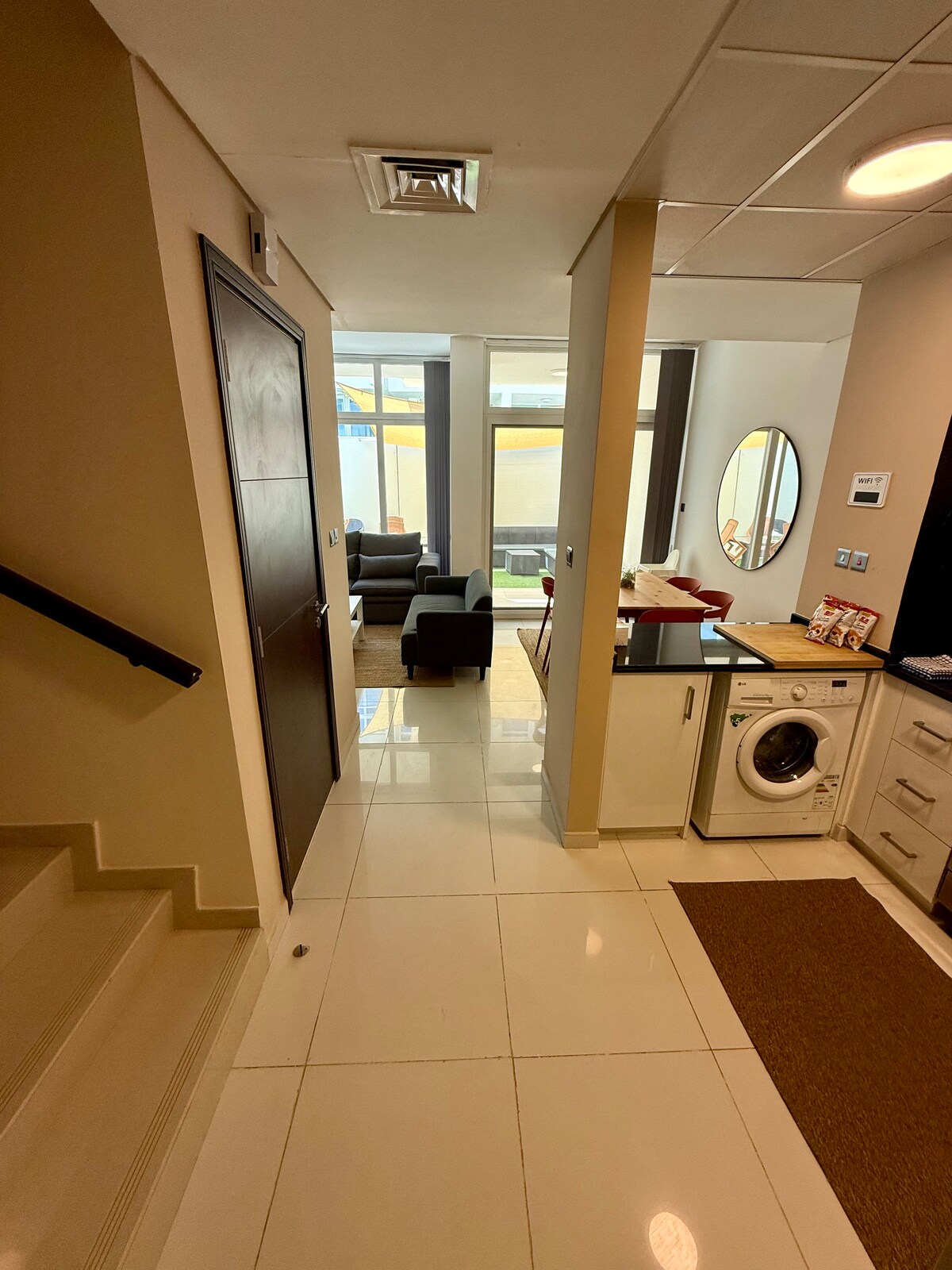 A large, fully furnished 2-bedroom apartment in central Al Ain. Fast, reliable, WiFi is available, ~500 Mbps fiber. Suitable for short or long stays and close to shops, restaurants, cafés, and malls. The unit includes a living room, two bathrooms, and a fully equipped kitchen with a fridge, stove, and washing machine. Each room has AC and the living area has a 65-inch smart TV. Clean and convenient for families and visitors, with easy check-in and fast support.