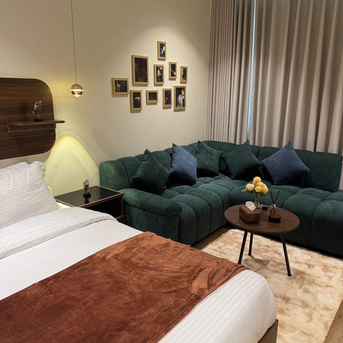 تحتوي الشقة على غرفة نوم مريحة بأجواء هادئة مثالية للنوم العميق، بالإضافة إلى غرفة خاصة للبانيو لتجربة استرخاء فريدة بعد يوم طويل. كما يوجد دورة مياه مستقلة مجهزة بكل ما تحتاجه. في قلب الشقة ستجد صالة فسيحة بكنبة مريحة مثالية للاسترخاء أو مشاهدة أفلامك المفضلة، مع بار أنيق يضيف لمسة عصرية رائعة ويجعل المكان مثالياً لقضاء وقت ممتع. • موقف سيارة خاص • إنترنت مجاني سريع مناسب للعمل والترفيه • أثاث راقٍ وتصميم أنيق • أجواء هادئة ومريحة