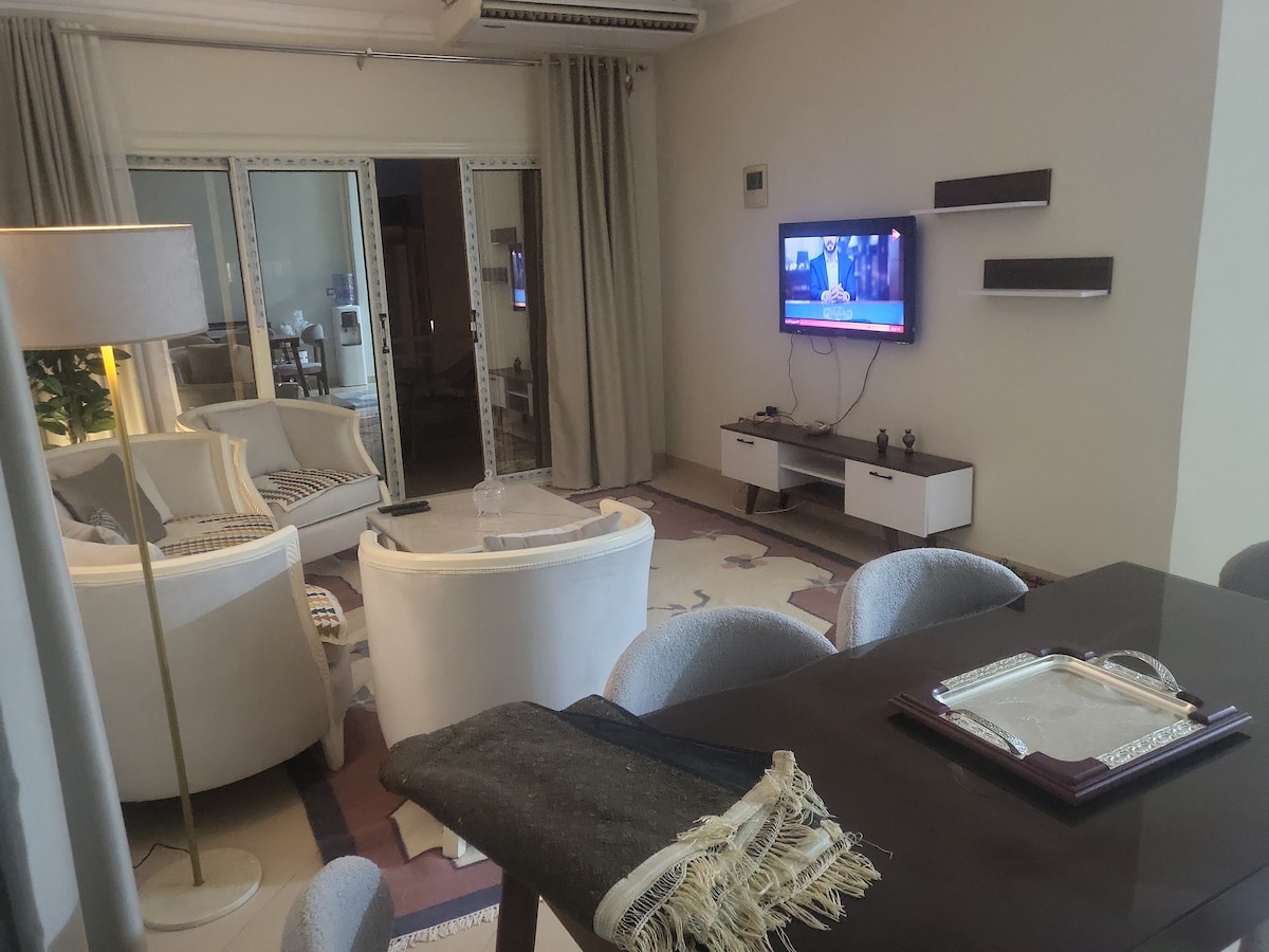 Willkommen in deinem Zuhause, geeignet für kurze und lange Aufenthalte. Unsere geräumige Wohnung mit 2 Schlafzimmern ist nur 5 Minuten vom Flughafen Kairo entfernt. Das Hauptschlafzimmer verfügt über ein Kingsize-Bett und ein Babybett für deine Kleinen (0-8 Jahre alt). Das zweite Schlafzimmer verfügt über zwei mittlere Betten. 50-Zoll-Fernseher (Netflix inklusive), die voll ausgestattete Küche hat alles, was du brauchst, von einem Gasherd bis hin zu einer Mikrowelle und einem Wasserkocher. Entspanne dich auf dem Balkon mit herrlichem Blick auf den Baum oder spaziere nur eine Minute zu lokalen Supermärkten, Bäckereien und vielem mehr.