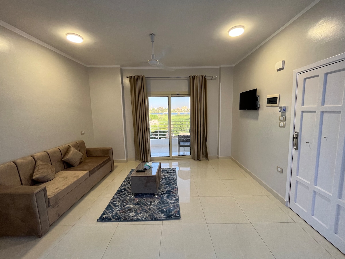 Ferienwohnung in idyllischer Lage in Luxor. Bietet eine einzigartige Mischung aus urbanem Leben mit natürlicher Schönheit. Direkt am Nil gelegen, befindet es sich in einer schönen, sicheren Wohnanlage abseits des hektischen Treibens der Stadt. Das üppige Grün, das ruhige Ambiente und die schöne Promenade machen es zu einem perfekten Rückzugsort. Voll ausgestattete Küche, 2 Badezimmer, große Terrassenfenster von der Lounge. Geräumige Terrasse. Das Resort unterstützt Gäste bei Bedarf mit einem Concierge-Service.