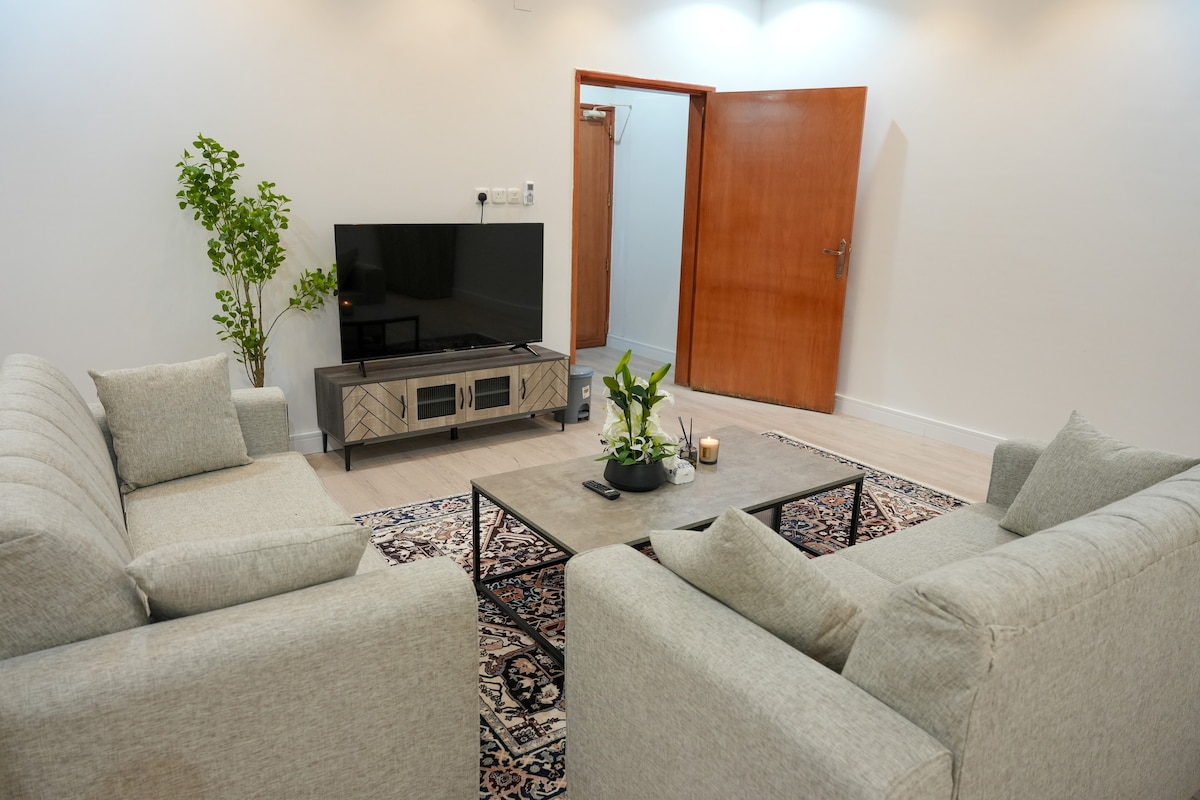 A comfortable and quiet studio apartment with quick self-check-in; featuring a master bed and a sofa/extra bed; a TV with Wi-Fi, and a bathroom; conveniently located near all services, cafes, and restaurants; and 30 minutes from Prince Nayef Airport.