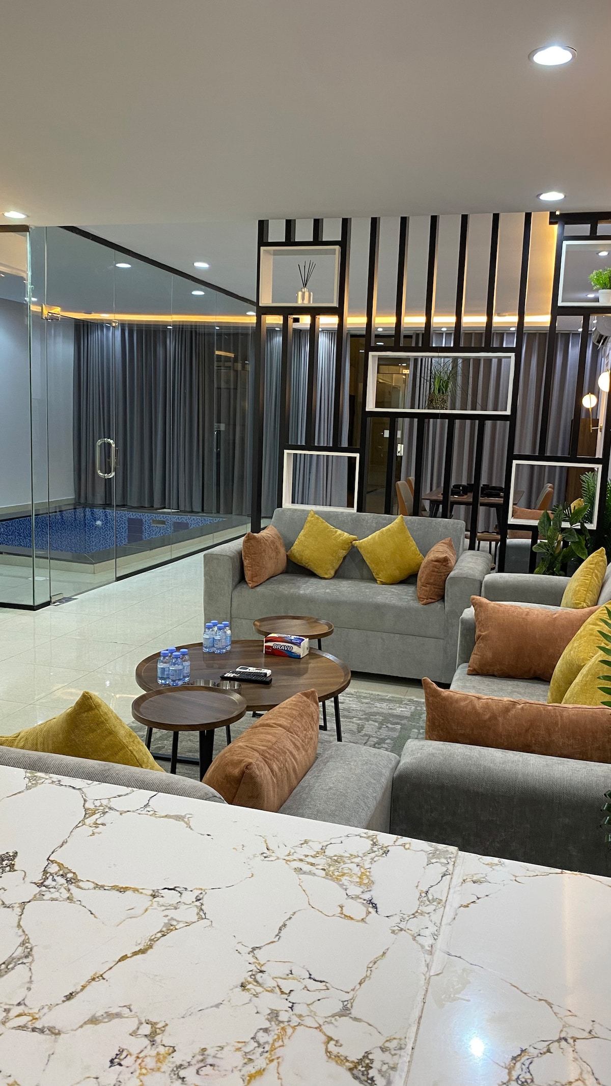 شاليه مودرن بنظام فندقي فاخر بتصميم انيق جدا وواسع لقضاء اجمل اليالي يحتوي على صالة واسعة بنظام فندقي وطاولة طعام مودرن بدورة مياة خاصة و كنب انيق ٧ اشخاص مع طاولات خدمة و غرف نوم سنمائية مع دورات مياه خاصة ويوجد مراتب اضافية شخصين مجانية عند الطلب المسبق و شاشة ذكية 75 بوصه 4K فيها جميع التطبيقات و ركن قهوة و مسبح و ثلاجة و اضاءات لد انيقة و مطبخ مع فرن وثلاجة ومكراويف وغلاية ماء و اواني طبخ و يوجد باب بايكة خاص لشالية لدخول السيارة و دخول ذاتي