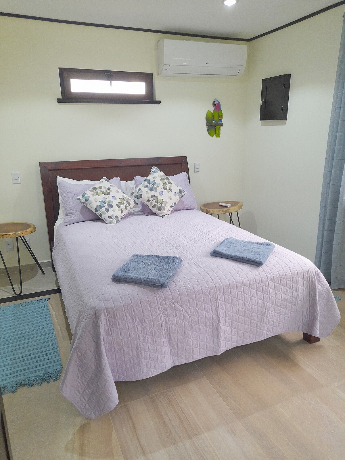 Private Wohnung mit separatem Eingang, ausgestattet mit Klimaanlage, voll ausgestatteter Küche, Kühlschrank, zwei Doppelbetten mit bequemen Matratzen, Kinderbett (optional), Babystuhl (optional), Bad mit Warmwasser, Mikrowelle, geräumig für Familien, verfügt über Grünflächen zum Spielen mit Kindern und/oder Haustieren, wir haben eine Waschmaschine auf dem Grundstück. Der Parkplatz ist überdacht. Wir haben einen Gemüsegarten und Obst, das Sie ohne zusätzliche Kosten genießen können.