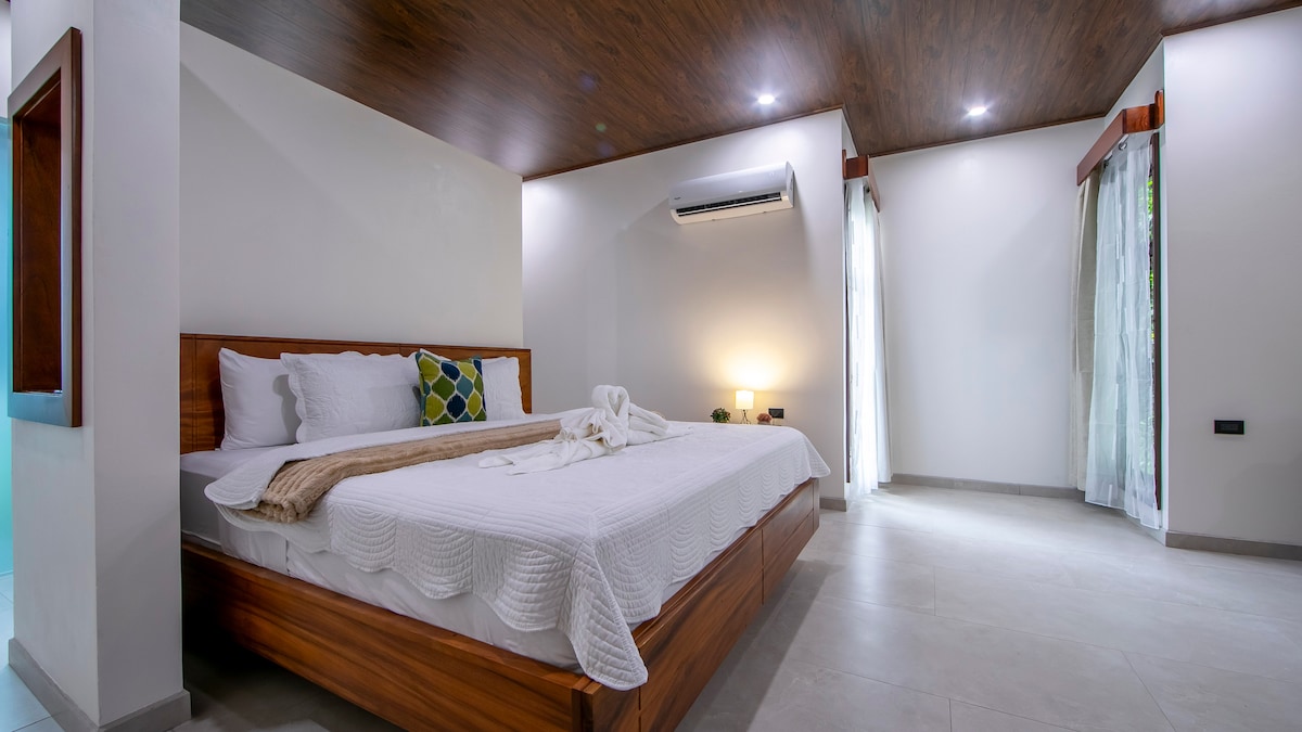 Entfliehe in einen abgelegenen, 163 Quadratmeter großen Rückzugsort im Industriestil, der in eine üppige Farm eingebettet ist und nur 2 km vom Herzen von La Fortuna entfernt liegt. Dieser einzigartige, fensterlose Hafen mit offenem Konzept verfügt über ein Kingsize-Bett, ein Queensize-Schlafsofa und eine voll ausgestattete Küche. Ein Luftsystem sorgt für eine erfrischende Brise im ganzen Haus, ergänzt durch eine Klimaanlage für perfekten Komfort. Genieße den Pool auf der Dachterrasse mit Sonnenbaden, Grillen und Barutensilien. Erkunde den nahegelegenen Bach und genieße die Ruhe von 32.000 Quadratfuß Privatland.