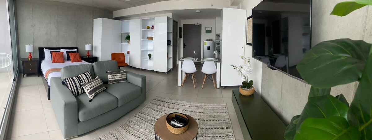 Tauche ein in den skurrilen Charme von Hightopp Village, einem Studio im 18. Stock mit Panoramablick auf die Berge. Zentral gelegen am La Sabana Park mit schnellem Zugang zum Flughafen und zu Geschäftszentren, ist es ideal für Touristen und Geschäftsreisende. Genießen Sie Premium-Annehmlichkeiten: beheizter Pool, voll ausgestattetes Fitnessstudio, Unterhaltungslounge, privates Kino, Co-Working-Space und Restaurant vor Ort – alles mit Sicherheit rund um die Uhr. Kostenlose Reinigung und Parkplätze – keine versteckten Gebühren – sorgen für einen sicheren, komfortablen und stressfreien Aufenthalt.