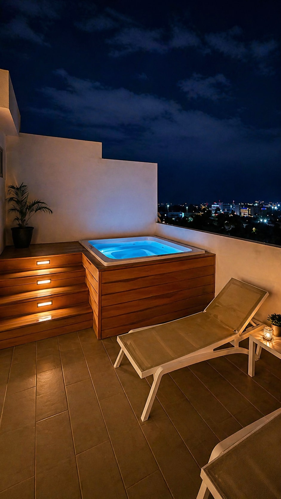 Bajo las estrellas de Santo Domingo, tu oasis privado te espera. ✨ Disfruta una experiencia exclusiva en esta terraza íntima con jacuzzi iluminado, perfecta para noches románticas, escapadas inolvidables o simplemente desconectar con estilo. Sumérgete mientras contemplas las luces de la ciudad, relájate en tu rooftop privado y vive el lujo de tener tu propio refugio urbano. Aquí cada noche se siente especial: privacidad, confort y una atmósfera diseñada para enamorar. 🌙💙