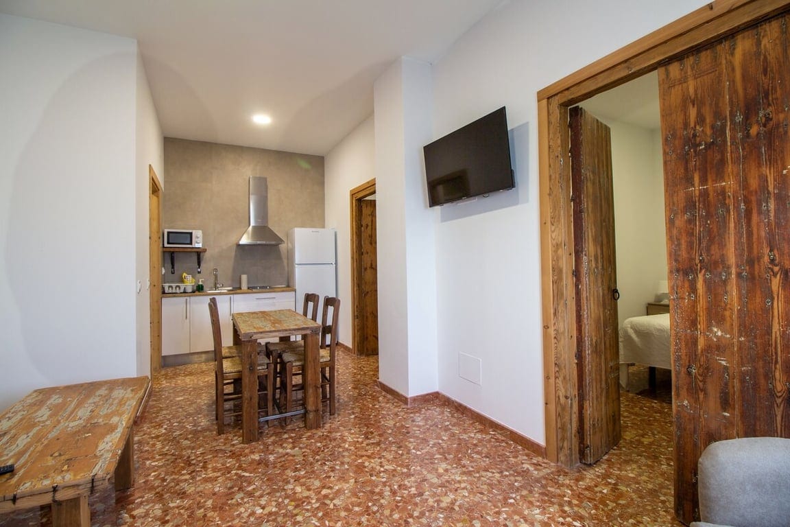 Charmante Wohnung im ersten Stock, die Ruhe und Komfort bietet. Beim Betreten werden Sie von einem geräumigen Esszimmer mit einer Decke mit zwei Wassern und freiliegenden Holzbalken begrüßt, die Geräumigkeit und Wärme bringen. Die Steinwände verleihen dem Raum ein rustikales und elegantes Flair und schaffen eine gemütliche und authentische Atmosphäre. Ideal für diejenigen, die einen Aufenthalt mit Charakter, Komfort und diesem besonderen Charme suchen, der sich vom ersten Moment an anfühlt.