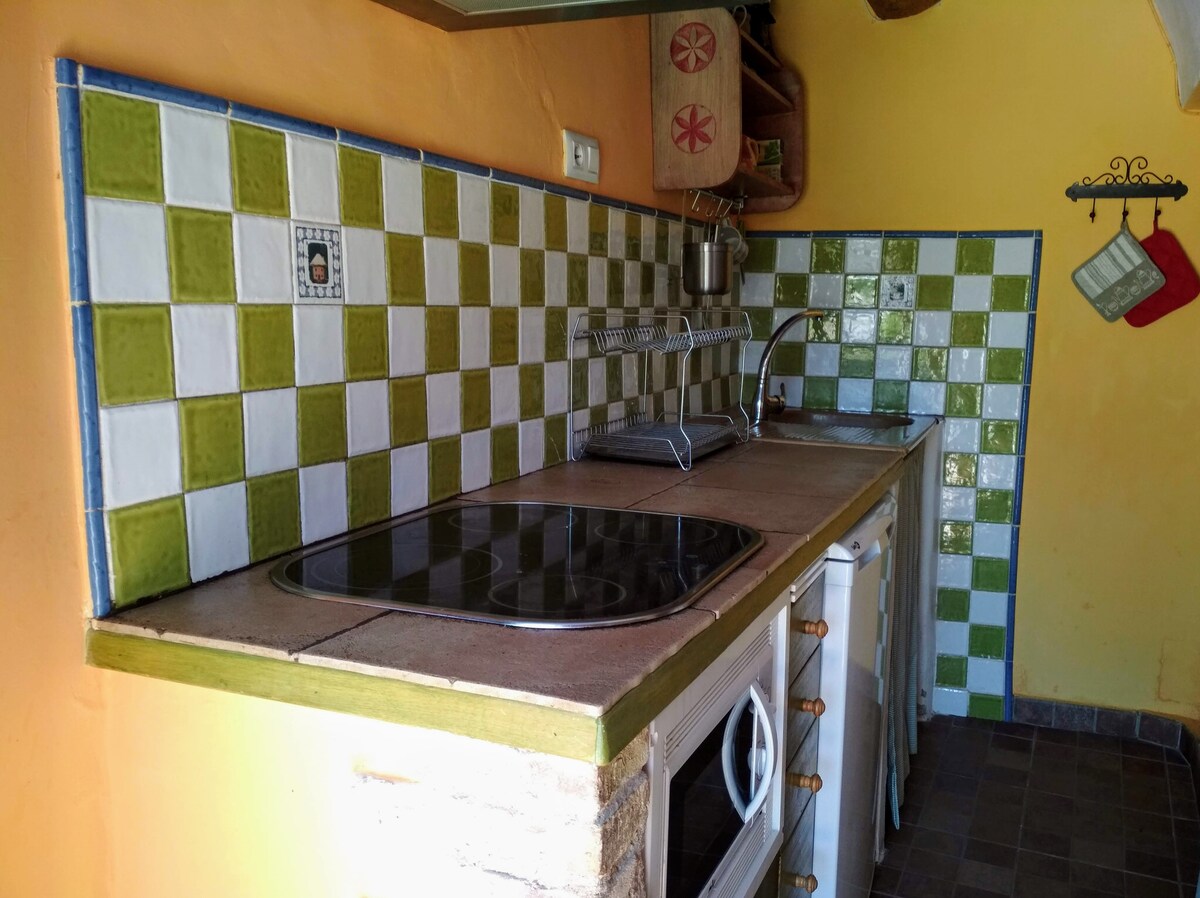 Pequeño apartamento completo en pueblo a 45km de Zaragoza. Ideal para dos personas.Muy luminoso, dormitorio, con cama doble ,balcón y baño con ducha dentro .Salon con cocina abierta y una terraza amueblada . Aire acondicionado y calefaccion. Wifi. Apartamento con entrada independiente . un solo dormitorio . Capacidad para cuatro personas. Durmiendo dos en el sofá cama. Esta en la entrada del pueblo y al lado de la huerta con un precioso paseo para disfrutar de la naturaleza y la tranquilidad