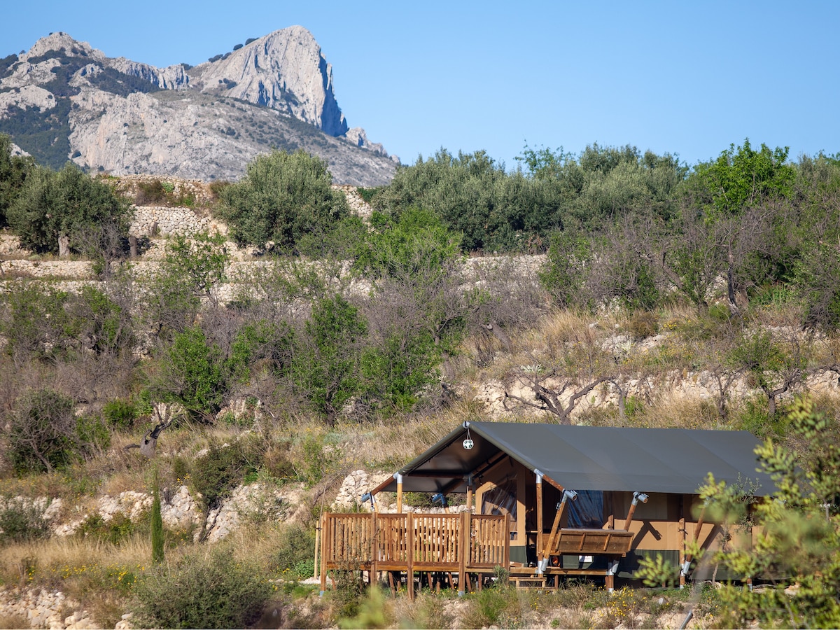 Das Safarizelt von Can Elisa befindet sich am Ende unseres Anwesens, 150 Meter von unserem Haus und den anderen Unterkünften entfernt. Genießen Sie Privatsphäre und einen schönen Blick auf die Berge und das Meer. Am Morgen werden Sie durch das Rauschen der Vögel und das Frühstück in der Morgensonne geweckt. Das Glamping-Zelt ist komplett möbliert, im Wohnzimmer findest du neben der Küche einen Esstisch und einen Lounge-Bereich mit TV vor. Das Schlafzimmer verfügt über ein Doppelbett, ein Bad en suite mit Dusche, Toilette und Waschbecken.