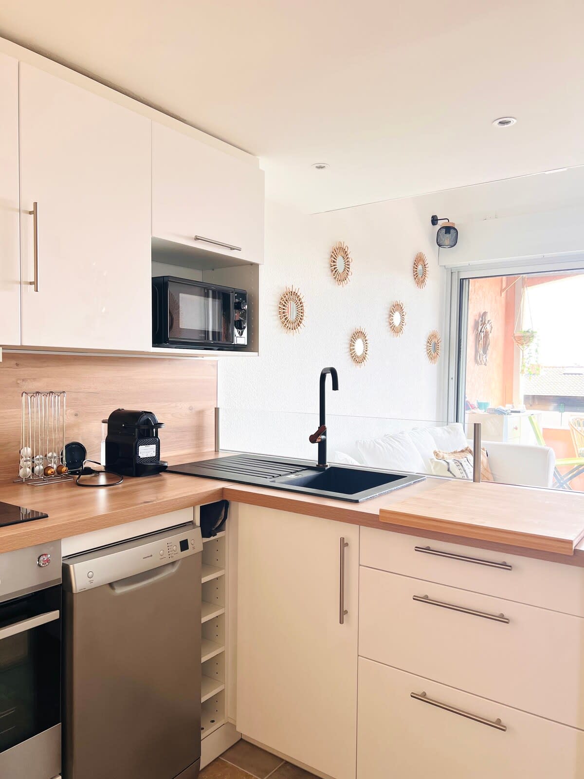 superbe appartement avec une vue à couper le souffle sur la mer..Au 1er étage d'une résidence avec place de parking et gardien.Une entrée par la mer, une par la ville,Portail automatique. Gare à moins de 5mn à pieds le port à 2 pas. marché le dimanche.superbe corniche pour les sportifs et les randonneurs. Terrasse de 36m2,toute équipée avec plancha.2 chambres une avec lit 160×200 à l étage avec rangements, la deuxième lit en 140×190 Salle d eau avec grande douche et WC Cuisine équipée