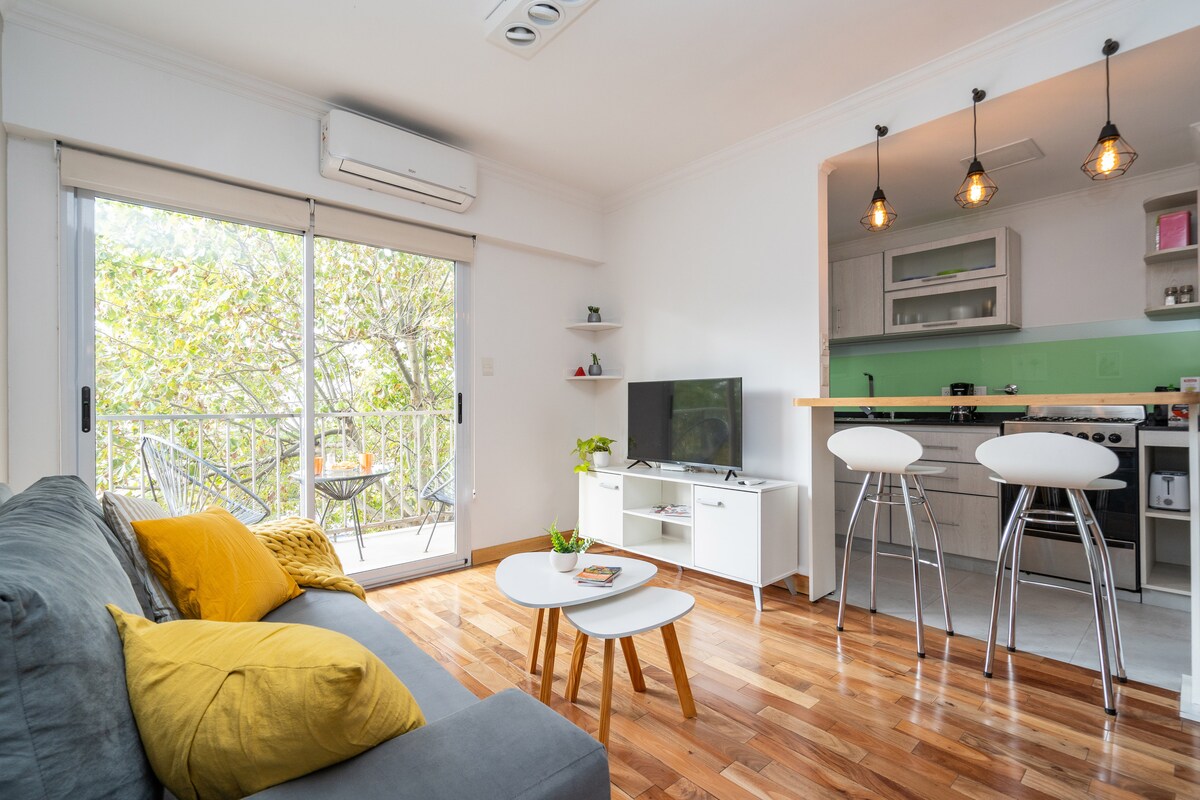 Departamento moderno y funcional con balcón privado y agradables vistas abiertas. El espacio incluye cama matrimonial, cocina completamente equipada, barra comedor y baño completo, pensado para brindar comodidad durante la estadía. El balcón invita a disfrutar del aire libre. Ubicado sobre Av. Río de Janeiro, con fácil acceso a transporte público, cafés y comercios. Perfecto para trabajo remoto, viajes urbanos o estadías temporales.