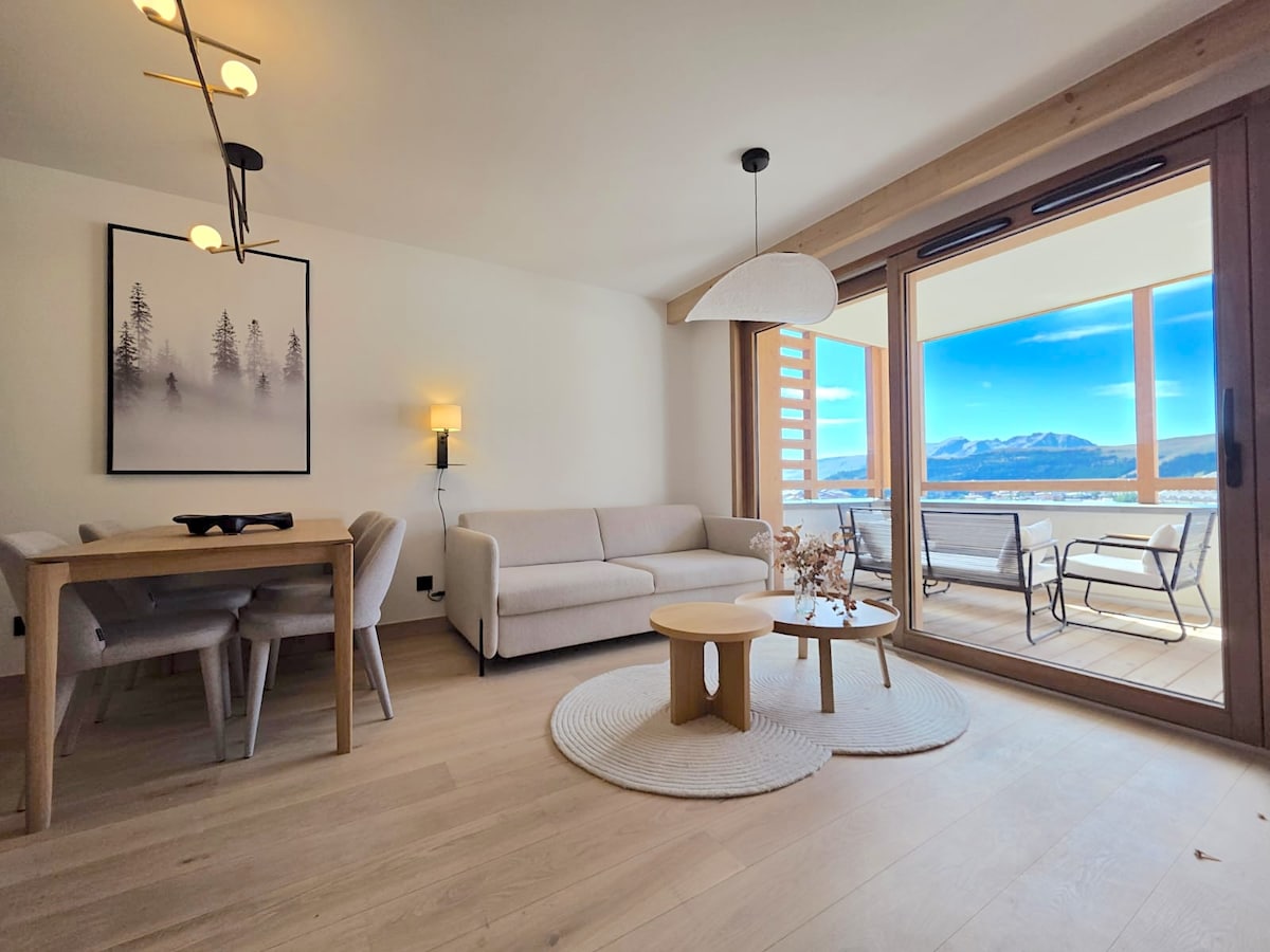 Wohnung von 35 m², komplett mit edlen Materialien renoviert. 180° Blick auf die Berge und das Resort. Ein Schlafzimmer mit Doppelbett 140, geschlossener Berg-Ecke (Schiebetür) mit Doppelstockbetten in 140, Badezimmer mit Dusche, voll ausgestattete Küche, die zum Wohnzimmer hin offen ist, möblierte Terrasse nach Süden, privater Parkplatz im Freien und Skischrank. Ideal gelegen im Zentrum des Ortes (200 m von der Avenue des Jeux) für eine Abfahrt (und Rückfahrt) mit Skiern an den Füßen.