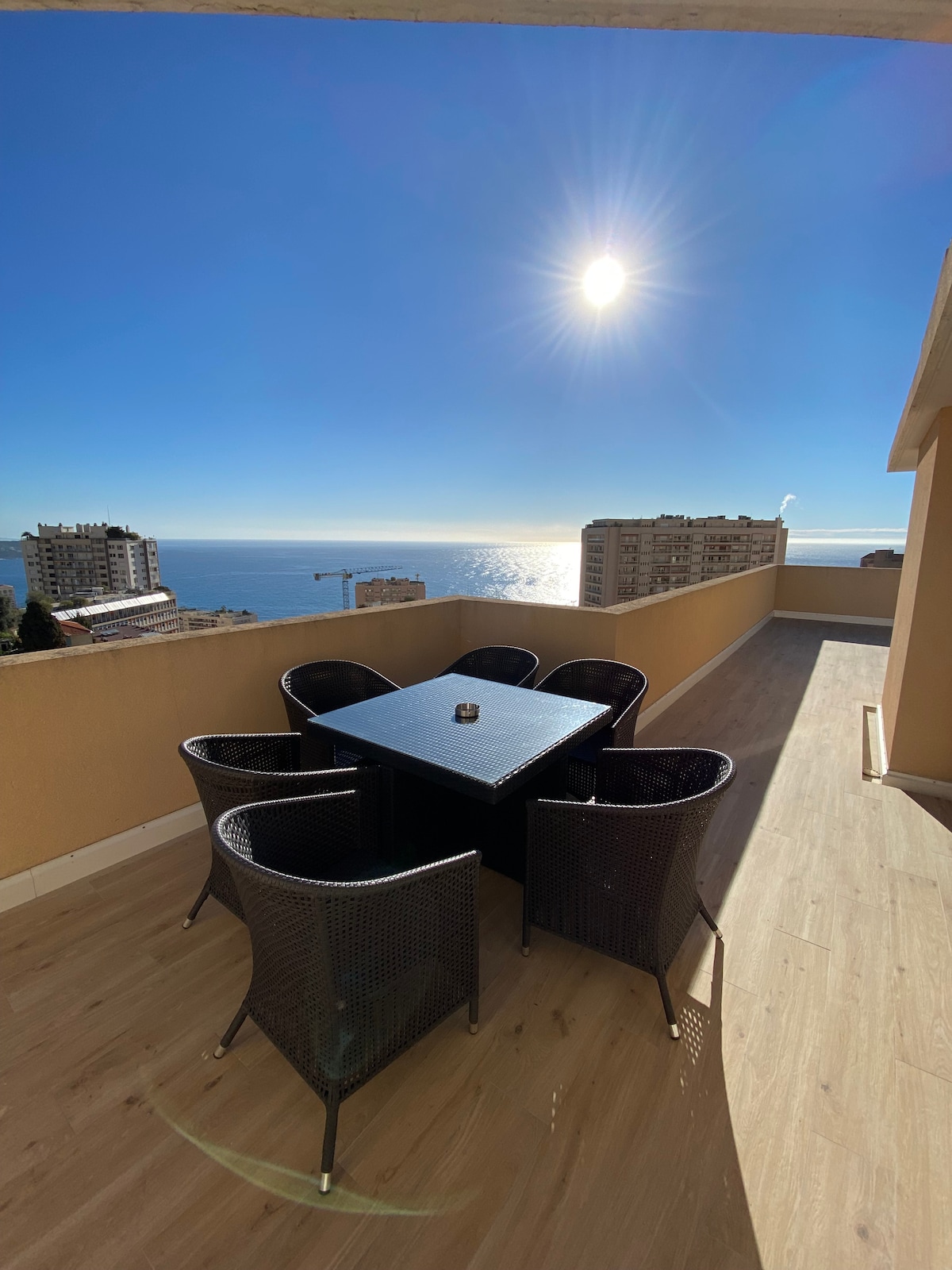 Exklusiv 🔝 NEU! Atemberaubendes Designer-Penthouse an der Grenze zu Monaco. Mit fantastischem Blick auf das Meer und Monaco! Im Jahr 2022 komplett renoviert! Große Terrasse mit herrlichem MEER- und Stadtblick! Im Sommer haben wir einen Whirlpool auf der Terrasse! Die Wohnung hat alles für einen angenehmen Aufenthalt! Private Tiefgarage in der Residenz ist im Preis enthalten. Penthouse in der Residenz Jardins d´Elisa. 100 Meter Boulevard de Mulan, 5 Gehminuten zum Strand Larvoto und Grimaldi Forum