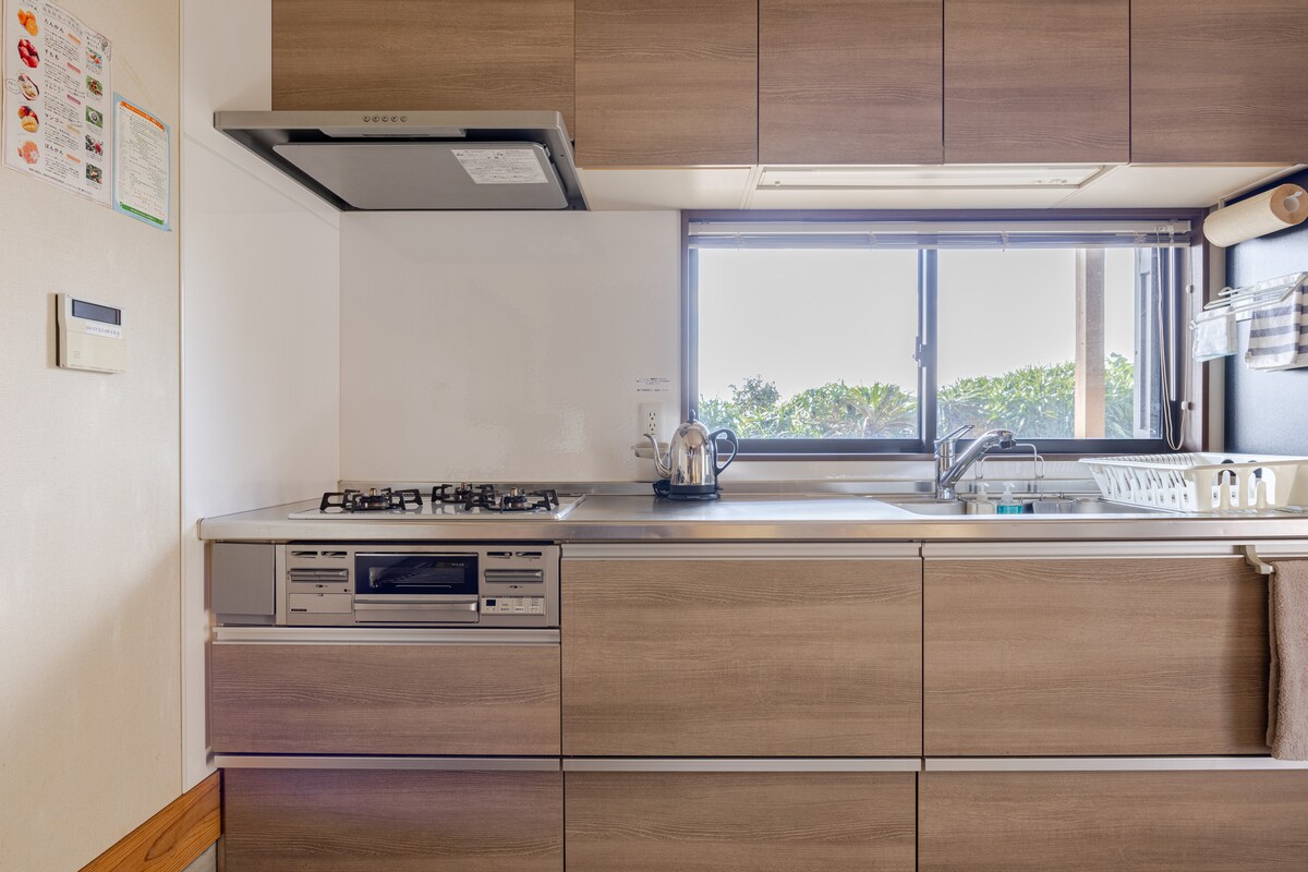 4 Minuten Fahrt vom Flughafen in Richtung Norden. Von dem Moment an, in dem Sie die Tür öffnen, beginnt das Resortleben auf der südlichen Insel. Das Gästehaus liegt in einem ruhigen Ort mit Blick auf das wunderschöne Meer im Norden von Amami, wo die unberührte Natur erhalten bleibt. Die geräumigen 134 Quadratmeter großen Zimmer bestehen aus 5 Räumen, einschließlich des Wohnzimmers. Die Unterkunft ist luxuriös und sauber und hat eine klassische Atmosphäre. Freunde und Familien können sich hier ungezwungen und in ihrem eigenen Stil entspannen. Die Holzterrasse ist mit dem Wohnzimmer verbunden. Bitte verbringen Sie eine glückselige Resort-Zeit, während Sie den klaren Himmel und das blaue Meer genießen. Bei Vollmond erscheint eine Mondstraße auf der Oberfläche des Meeres. Der Mond, den Sie von der Terrasse aus sehen können, ist auch außergewöhnlich. Hören Sie dem Rauschen der Wellen zu, während Sie einschlafen und erwachen Sie mit dem Zwitschern der Vögel. Spüren Sie die Natur und verbringen Sie Ihre Zeit ganz ohne Hektik. Genießen Sie die langsam vergehende Zeit auf Amami in der voll ausgestatteten MAISON DE AILE. Perfekt für einen erholsamen Urlaub für Erwachsene. * Grillen ist verboten. * Da es ein Nachbarhaus gibt, ist es nach 21:00 Uhr verboten, sich auf dem Deck oder im Freien zu unterhalten oder zu essen und zu trinken. Bitte beachten Sie diese Regeln.
