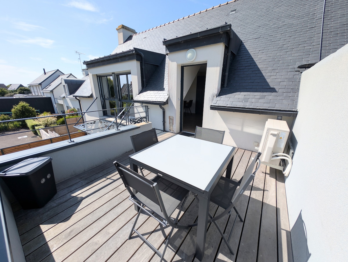 Kürzlich renoviertes Bauernhaus, das zum Herrenhaus am Meer gehört. Geschmackvoll eingerichtet vom Eigentümer (Maler und Architekt) - komplett ausgestattet mit allem, was man im Urlaub braucht - komfortable Schlafzimmer mit eigenen Badezimmern, nach Westen ausgerichtete Terrasse mit Grill, Waschmaschinen und Waschmaschinen. Sonniges und geräumiges Wohnzimmer. Télévision, Internet, Musikanlage. Das Meer 3 Minuten zu Fuß entfernt. Charmantes Dorf mit Markt und Supermarkt 4 Minuten Fahrt vom Haus entfernt. Golfplatz 10 Autominuten entfernt.