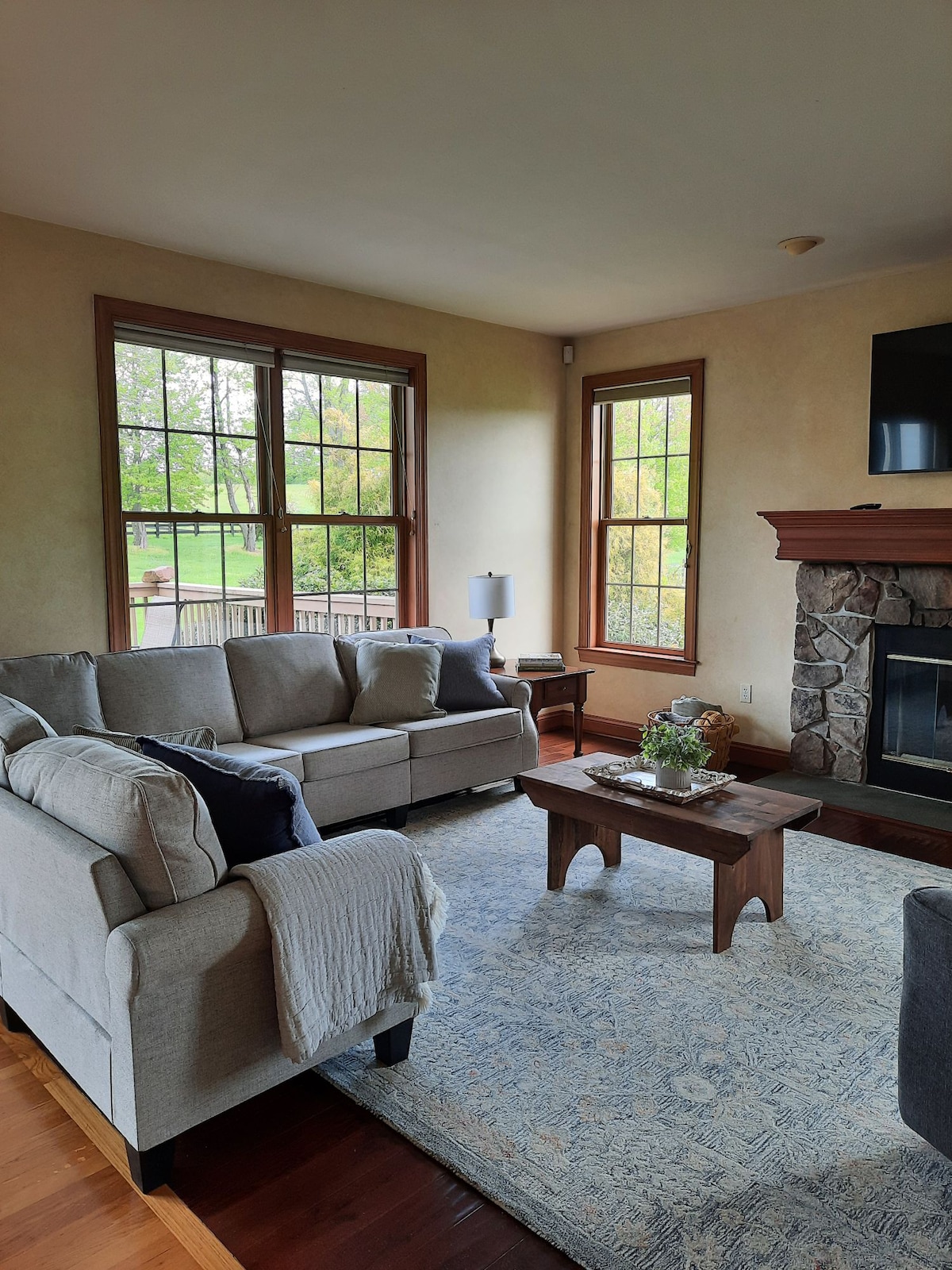 This beautiful, spacious home is located in scenic Berks Co. Guests will enjoy comfortable accommodation with plenty of room to spread out: A large kitchen w all the essentials for cooking, 2 living room spaces, a Smart TV and WIFI throughout, 5 bedrooms (2 bedrooms have king beds), 2.5 baths, lots of outdoor spaces including a large deck w outdoor seating and pellet grill, a swing set for childen, a firepit, and a fenced in outdoor pool (2ft to 9ft) available Memorial Day to Labor Day.