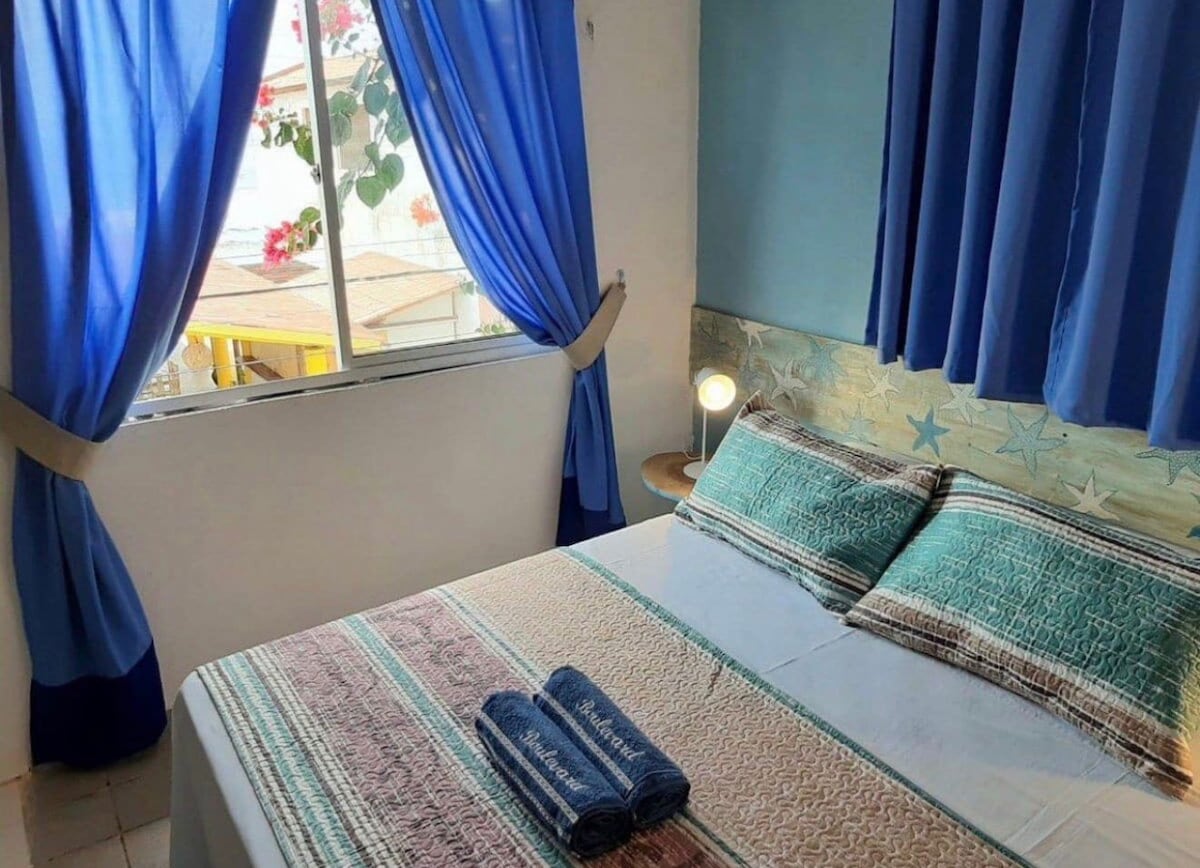 Eine Wohnung für 4 Personen, kombiniert Charme und Funktionalität in einem kompakten Raum. 1 Schlafzimmer mit einem Doppelbett und Ventilator, ein weiteres mit einem Doppelbett und Klimaanlage, eine kleine ausgestattete Küche und ein Balkon mit Blick auf den Kokospalmenhain. Das Fenster ermöglicht den Zugang von natürlichem Licht und der Belüftung und schafft eine einladende Umgebung. Das Studio befindet sich in der Nähe von Casa Janjão und Cabana do Kite, mit Einrichtungen zum Segeln, Mittagessen, Snack und Trinken auf einen Drink. Diese befindet sich in der Straße des Restaurants O Aroma!