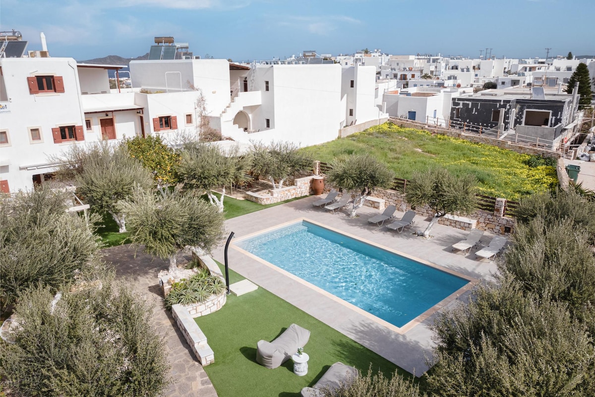 Die Vastblue Luxus-Residenz ist eine unabhängige Wohnung (85 qm), 70 Meter vom Meer und 5 Gehminuten vom berühmten Sandstrand von Ampelas entfernt. Sie verfügt über einen privaten Pool, zwei geräumige Veranden mit herrlichem Blick auf das Meer und die benachbarte Insel Naxos. Es gibt zwei Schlafzimmer, zwei Badezimmer, eine große, voll ausgestattete Küche mit einem Esstisch und ein Wohnzimmer. Sie ist sehr sauber und komfortabel und verbindet die traditionelle kykladische Architektur mit modernem Design.