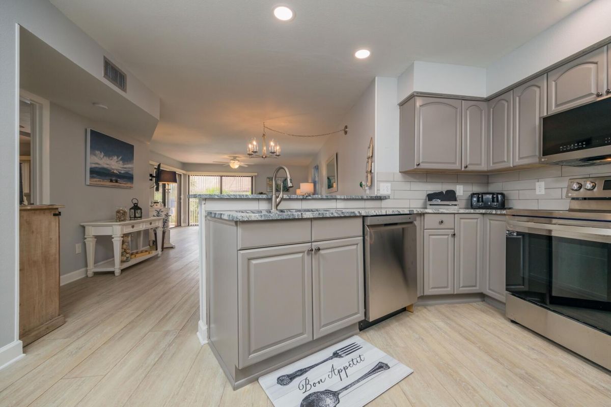 Newly Remodeled 1 bedroom condo with King Size Bed, Queen Size Sleeper Sofa, 55" TV's in Living Room and Bedroom. Stairs to 3rd Floor unit with private patio. Fully Equipped Kitchen, Dishwasher, Washer/Dryer, WiFi, Cable TV, Clubhouse, Fitness Room, Tennis Courts, 2 Swimming Pools (1 heated), Shuffleboard Courts, Picnic Area with Grills & Private Beach Walkway. Dog Friendly (1 DOG ONLY) with a $100 pet fee due on Check In. Must be able to climb stairs 3rd floor condo