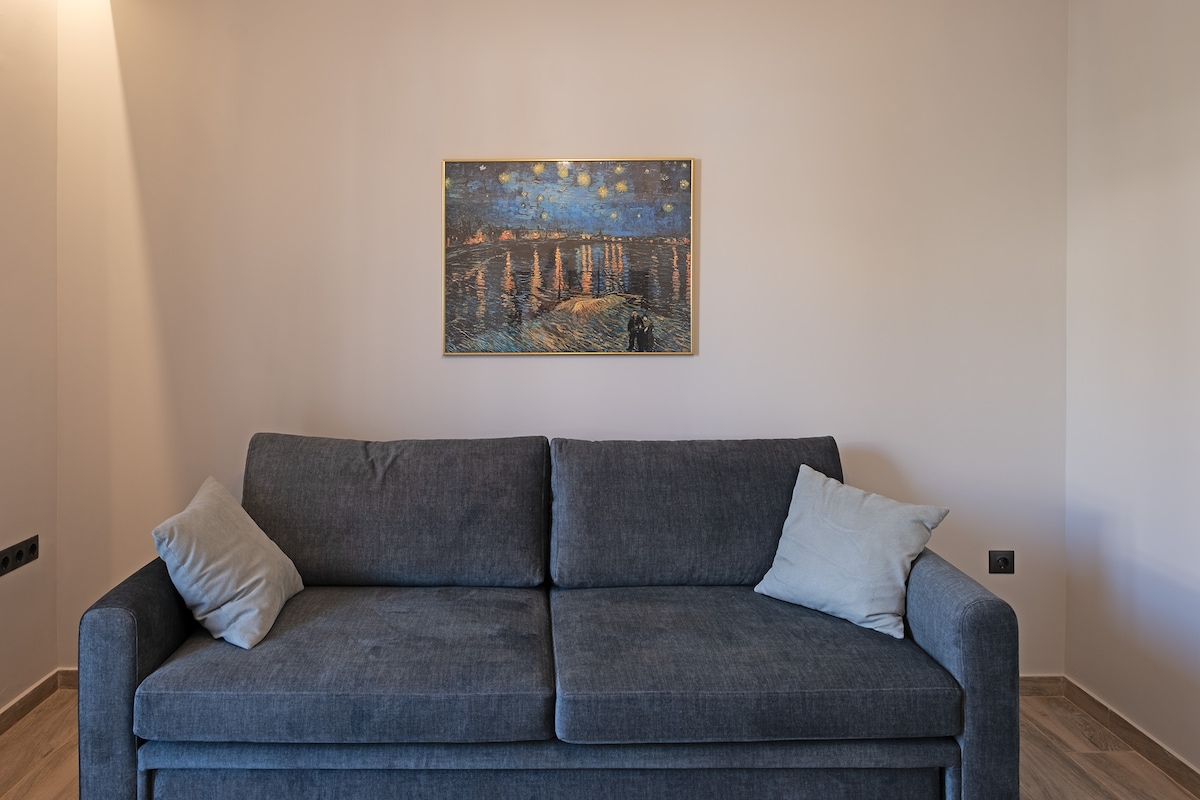Neu, komplett renoviertes Studio im 1. Stock im Herzen von Kalamata, in unmittelbarer Nähe des Hauptplatzes und des Internationalen Tanzzentrums. Sie verfügt über 1 Kingsize-Bett und eine voll ausgestattete Küche. Modern, gut eingerichtet und voll funktionsfähig. Sie eignet sich für Paare, Familien mit Kleinkindern, Fachkräfte oder alle anderen, die Entspannung und Ruhe wünschen.