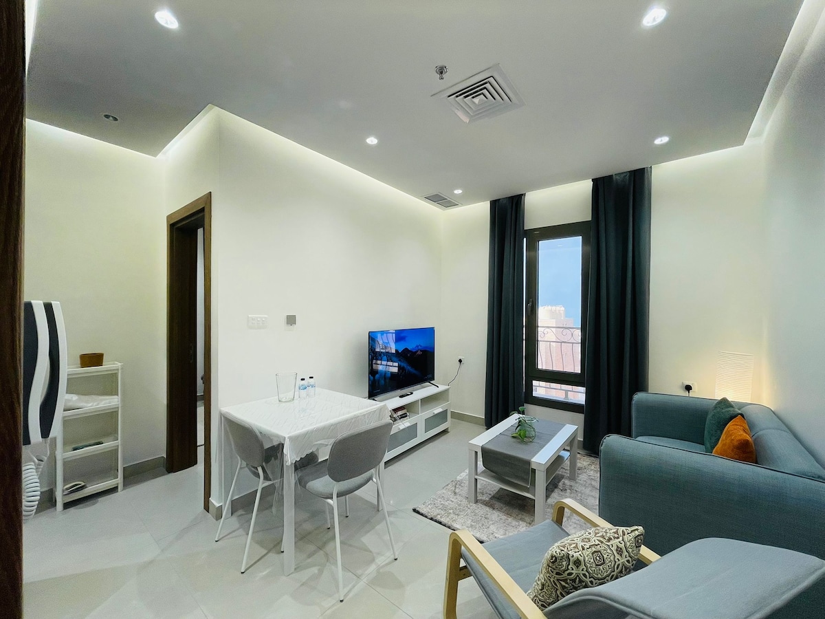The perfect blend of a simple, affordable and comfortable stay in the heart of Salmiya. *Self checkin(code provided before checkin *Apt has 2Bedroom with one being the Master with attached bathroom *Both bedroom has queen beds(160*200) perfect for 2 person. *Apt has 5G internet *70" Samsung TV in Living and 55" Wansa TV Master bedroom with Netflix, Prime Video& YouTube. * All basic Toiletry things are provided * Kitchen with basic appliances including washing machine. *Fridge with minibar