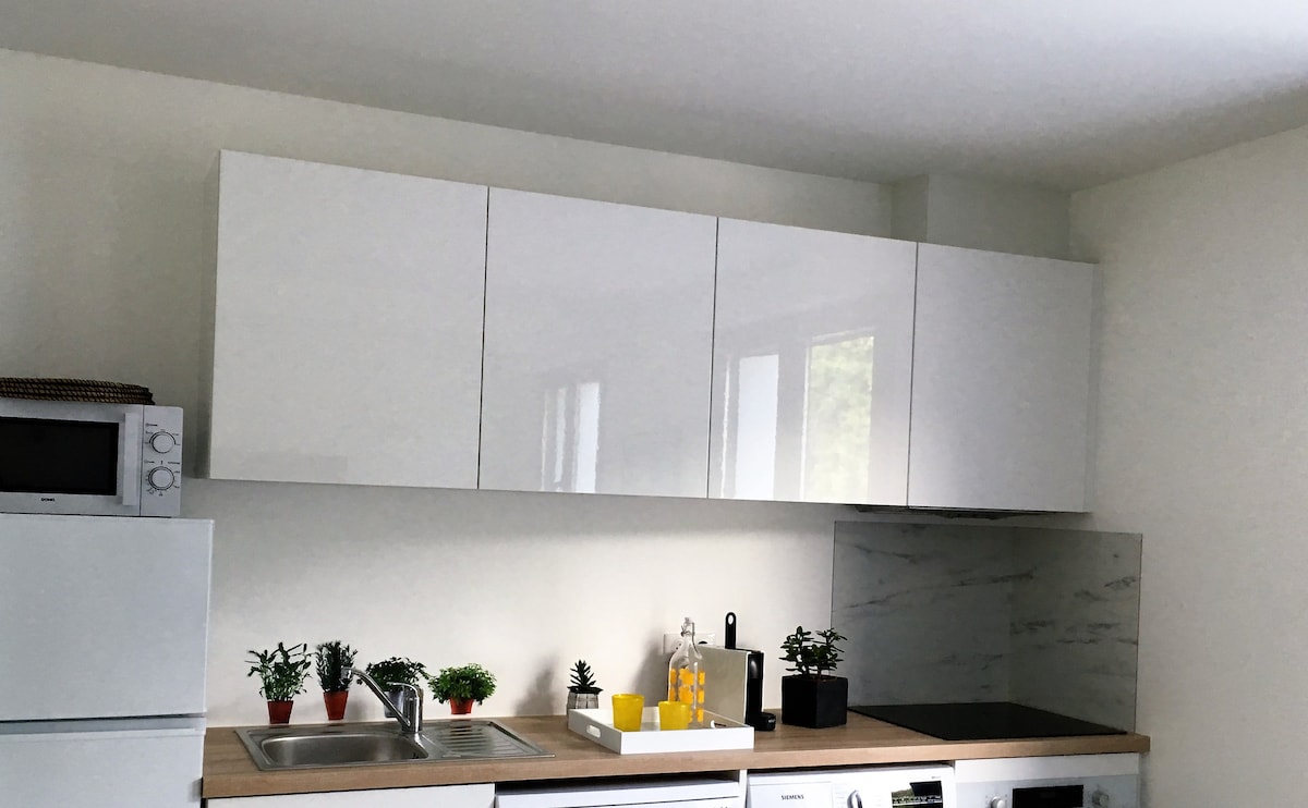 In einem Einfamilienhaus (keine anderen Bewohner im Haus) Eine Wohnung, die im Jahr 2020 renoviert wurde, sonnendurchflutet, mit Garten: Eingang, Wohnzimmer, hoch ausgestattete Küche, ein Schlafzimmer (ein Bett von 160 cm) und ein Schlafzimmer mit zwei Betten von 90 cm, die zu einem Bett von 180 cm zusammengestellt werden können), Duschbad, separates WC. Außenbereich mit Gartentisch und Stühlen. Einfache und kostenlose Parkmöglichkeiten an der Straße