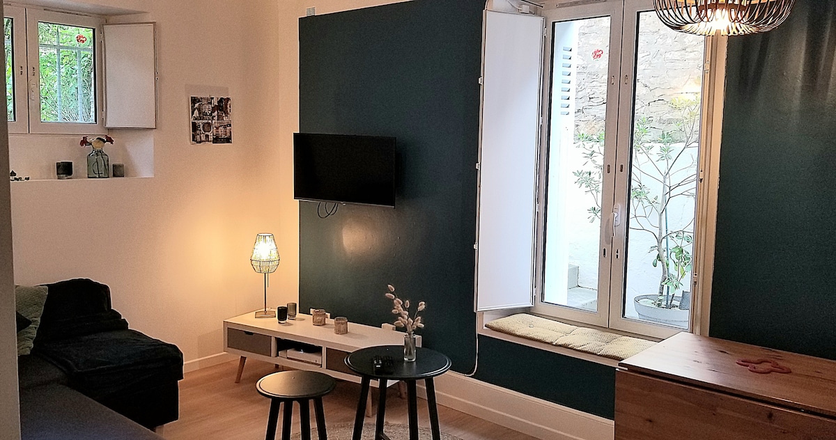 Vous séjournerez dans un cadre reposant au cœur de la ville. Ce grand T2 peut accueillir 2 à 4 personnes. Il bénéficie d’une grande terrasse, un jardin avec une belle vue sans vis à vis, une chambre avec Literie 160 récente et très confortable. Profitez du petit-déjeuner sur la terrasse aux premières lueurs du soleil et des dîners sous les étoiles avec une vue sur les lumières de la ville. Une place de parking vous est réservée