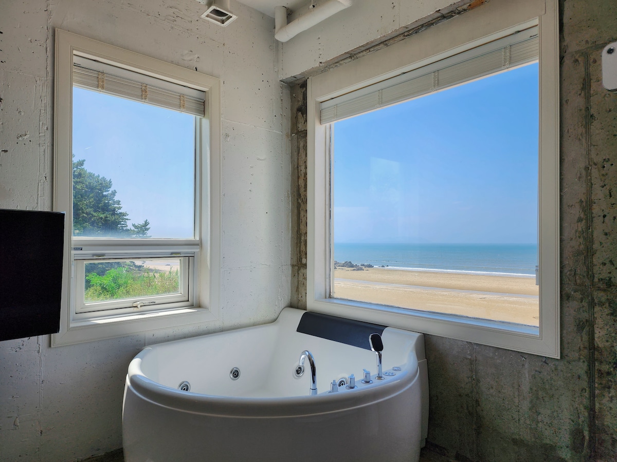 [Coast 2], eine private Pension im ersten Stock der Unterkunft, besteht aus einem Schlafzimmer, einem Wohnzimmer, 2 Badezimmer und einem Esszimmer. Es ist ein schöner Ort, an dem sich das Meer direkt vor dir von überall aus entfaltet. Es befindet sich vor einer großen Rasenfläche und einem privaten Meer, so dass es sehr friedlich ist und für diejenigen empfohlen wird, die eine romantische Heilungsreise machen. Es gibt einen privaten Eingang zum ersten Stock, der privat genutzt werden kann. In der Küche kann man nur ein Weizenset oder eine einfache Mahlzeit erhitzen. Kalodomas sind nicht verfügbar. Maeuntang Fischkochen ist nicht möglich.