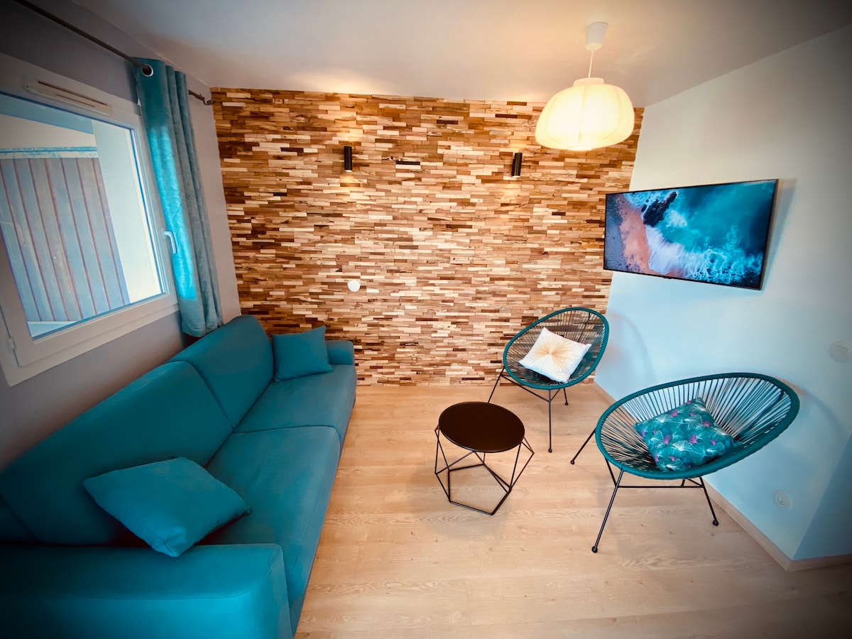 L'Escapade***, Wohnung von 55m2, Doppelterrasse mit Blick 300 m vom Lac du Bourget - Quartier Petit Port. Das Hotel liegt in einer Hotelresidenz mit der Möglichkeit zum Frühstück. Parkplatz zur Verfügung + Fahrradabstellplatz. Aufzug in den dritten Stock. Doppelte Süd- und Westausrichtung: - 1 große Terrasse von mehr als 20m2 mit Grill +Tisch 6 Personen und Sonnenbaden - 1 überdachte Terrasse von 12m2 mit Gartenmöbeln ideal für einen Aperitif mit Blick auf die Dent du Chat.