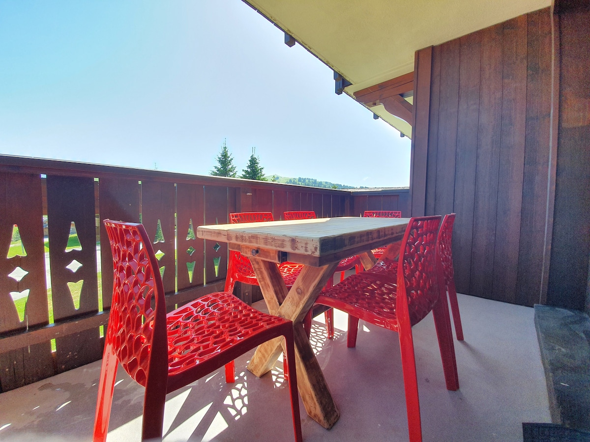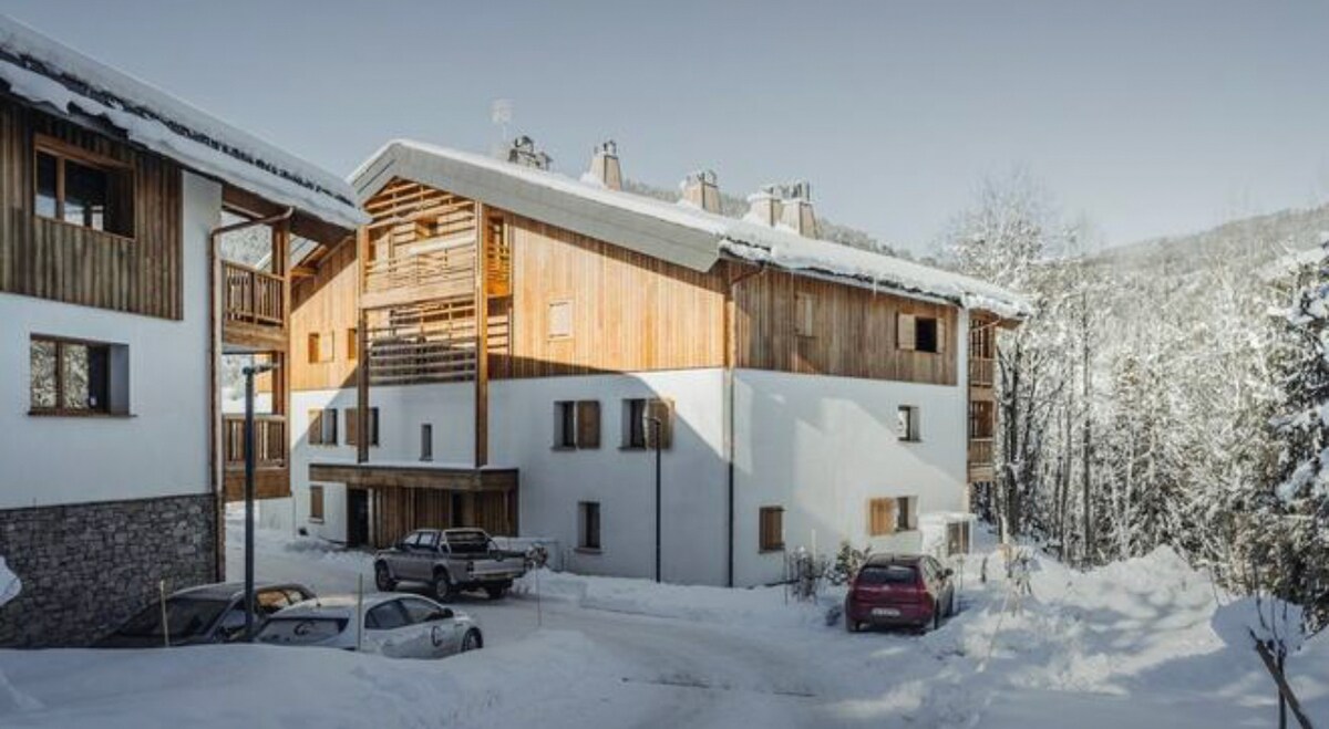 Joli appartement savoyard dans station familiale, activités sportives variées. La Piscine et la salle de jeux sont ouverts du 15 décembre 2025 au 21 mars 2026. et du 20 juin 2026 au 12 septembre 2026. Les animaux de compagnie sont acceptés avec un supplément tarifaire de 5€/nuit Hiver: pistes alpin et de ski de fond et biathlon, raquettes. Eté: pistes de VTT, randonnées/trail, via ferrata, balades à cheval, accrobranche.