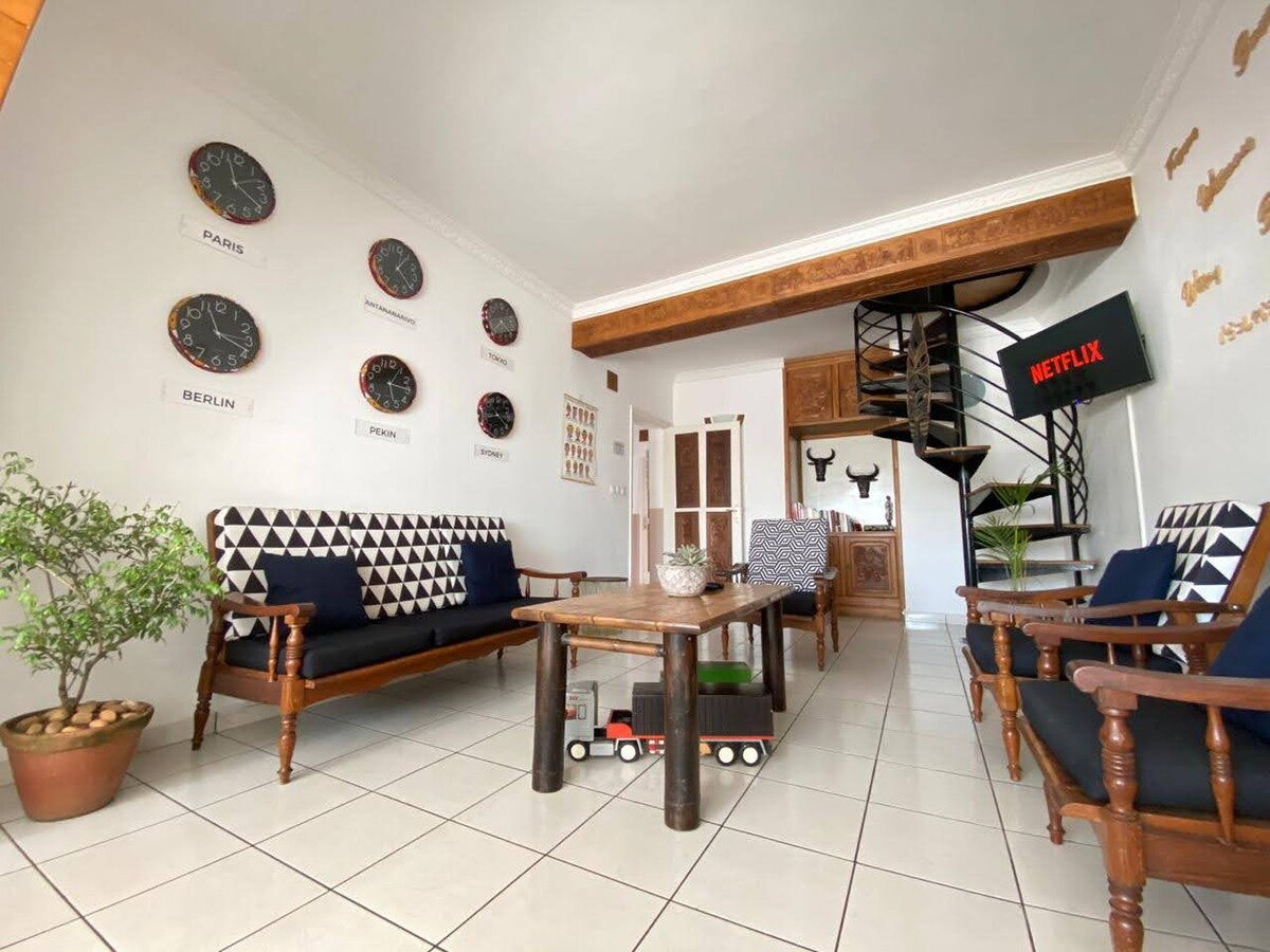 🏡 Geräumig und hell, perfekt für Familien oder Gruppen ✨. 🛏️ 4 Schlafzimmer, 🍽️ voll ausgestattete Küche, 📶 kostenloses WLAN und 🚗 Privatparkplatz. 📍 In der Nähe des Stadtzentrums, 🏡 ruhig und sicher, 👮 mit einem 24/7-Sicherheitsdienst. 🌍 Ideal, um Madagaskar mit absoluter Sicherheit zu erkunden 🇲🇬🌞. 🔥 Genieße eine warme Atmosphäre und 🏡 persönlichen Service für einen unvergesslichen Aufenthalt💖. 🌅 Private Terrasse, 🛏️ Bettwäsche vorhanden und 🗺️ in der Nähe von Touristenattraktionen .